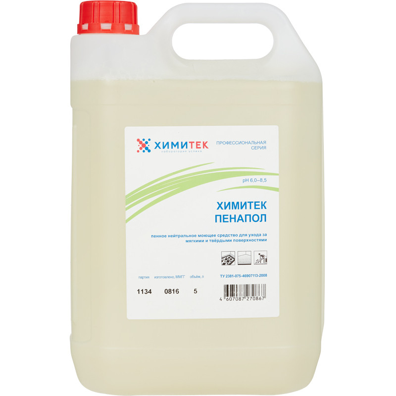 Концентрированное жидкое пенное нейтральное моющее средство для ухода за мягкими и твердыми поверхностями Химитек ПенаполНазначение: Предназначено для ручной очистки ковров, ковровых покрытий, мягкой мебели, текстиля, автомобильных сидений, а также для ухода за полами и любыми другими твердыми поверхностями. Удаляет бытовые и атмосферно-почвенные загрязнения, в том числе сажистые следы от обуви. Применяется на предприятиях различного профиля, в том числе в ЛПУ, санаторно-курортных, детских, дошкольных, школьных и других аналогичных учреждениях, в быту.Способ применения: Перед применением рекомендуется проверить устойчивость материала и красителя к средству в незаметном месте. Средство используют в виде 0,5%-20% рабочих растворов, которые готовят в емкостях из любого материала добавлением концентрата в воду. Температурный режим - от 20°C до 60°C.Для чистки ковровых покрытий, текстиля, мягкой мебели рекомендуются 5%-20% рабочие растворы. Раствор интенсивно перемешать до образования обильной пены, нанести пену на обрабатываемую поверхность, через 10-15 минут снять остатки загрязнений жесткой щеткой, пылесосом. Ориентировочный расход раствора - 30-60 г на 1 м.Для ухода за твердыми поверхностями рекомендуются 0,5%-3,0% рабочие растворы, которые наносят методами орошения, протирания. Ориентировочный расход раствора - 20-40 г на 1 м.Срок годности рабочих растворов - не менее 7 суток.Меры предосторожности: Избегать попадания средства в глаза и на кожу. При работе со средством рекомендуется пользоваться резиновыми перчатками. Хранить в недоступном для детей месте.В случае попадания средства в глаза или на кожные покровы рекомендуется промывание проточной водой. При необходимости обратиться к врачу. Условия хранения: Хранить в закрытом виде при температуре от 0°C до +35°C.Состав: Вода 30%, анионный ПАВ 5%, но <15%, гликоли <5%, тетранатриевая соль ЭДТА <5%, консервант <5%.Срок годности: 2 года при соблюдении условий хранения в невскрытой упаковке производителя.