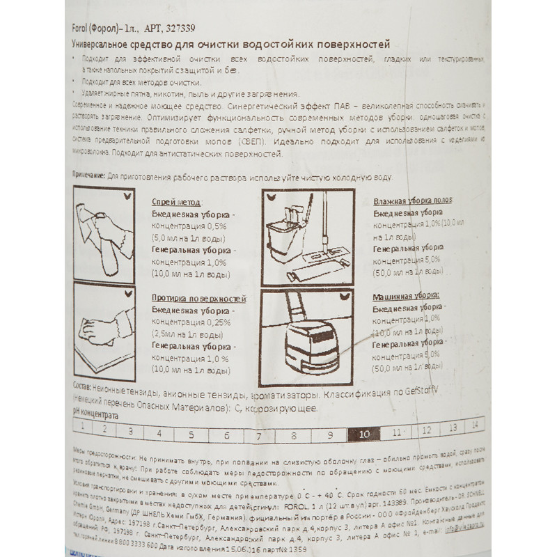 Универсальное средство для очистки водостойких поверхностей Dr.Schell Forol<br><b>Назначение: </b><br>Средство предназначено для очистки любых водоустойчивых поверхностей от всех типов грязи, таких как пыль, ржавчина, никотин, свежие следы чернил, штемпельной краски, остатки жира и масла. Применяется на объектах различного типа: административные, офисные, больничные, школьные, столовые, кухни и индустриальные объекты.<br><b>Способ применения </b>:<br>В зависимости от степени загрязнения разводится в воде в пропорции от неразбавленного до 1:400. Для обычных загрязнений и поддерживающей уборки разбавить средство в пропорции 0,25% (10 мл на 4 л воды), или для очень сильных загрязнений и пятен, например, таких как отпечатки пальцев на структурированном пластике, средство может наноситься в более высокой концентрации или применяться неразбавленным.<br>Затем необходимо тщательно промыть водой. Возможно также нанесение средства методом спрей-уборки.<br><b>Меры предосторожности: </b><br>При попадании в глаза промывать холодной водой. При случайном попадании внутрь, обратитесь за медицинской помощью. Хранить в недоступном для детей месте.<br><b>Состав: </b> Анионные и неионогенные ПАВ, спирт, отдушка, красители.<br><b>Условия хранения:</b><br>Хранить плотно закрытым в оригинальной упаковке при температуре от 0°C до +40°C.<br><b>Срок годности: </b> 60 месяцев с даты изготовления.