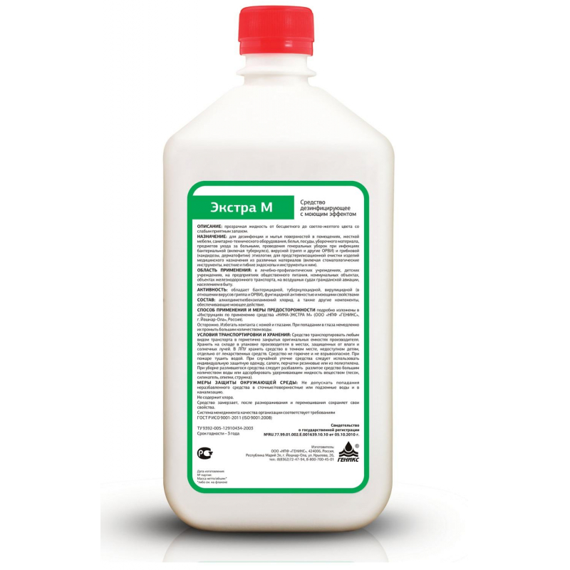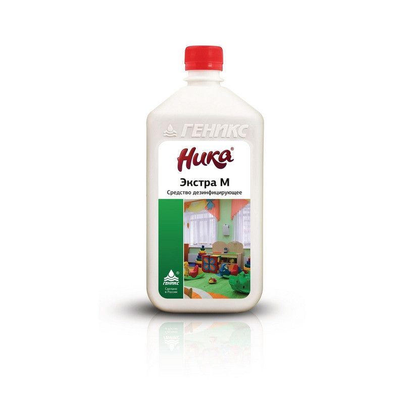 Дезинфицирующее средство с моющим эффектом ?Ника-Экстра М? Назначение: средство "Ника-Экстра М" предназначено для дезинфекции и мытья поверхностей в помещениях, жесткой мебели, санитарно-технического оборудования, белья, посуды, уборочного материала, предметов ухода за больными, при инфекциях бактериальной (включая туберкулез), вирусной (грипп и другие ОРВИ) и грибковой (кандидозы и дерматофитии)этиологии при проведении профилактической, текущей и заключительной дезинфекции; для проведения генеральных уборок в ЛПУ, детских учреждениях, на предприятиях общественного питания, коммунальных объектах, объектах железнодорожного транспорта и населением в быту; для предстерилизационной очистки изделий медицинского назначения из различных материалов (включая стоматологические инструменты, жесткие и гибкие эндоскопы и инструменты к ним) в ЛПУ. Свойства: средство "Ника-Экстра М" оказывает антимикробное действие в отношении бактерий (включая микобактерии туберкулеза), вирусов гриппа и других возбудителей острых респираторных вирусных инфекций (ОРВИ), грибов рода Кандида, дерматофитов. Растворы средства обладают моющими свойствами. Способ применения: Рабочие растворы средства готовят в стеклянной, пластмассовой или эмалированой посуде путем растворения концентрата средства в воде, исходя из расчетов и режимов дезинфекции, приведенных в Инструкции по использованию средства. Поверхности: бактерии 0,5% - 30мин.; вирусы (ОРВИ, грипп) 4.0% - 60мин.; Дезинфекция посуды: бактерии 0,3% - 15мин.; вирусы 4,0% - 30мин.; Санитарно-техническое оборудование: бактерии 0,5% - 30мин.; вирусы 4,0% - 60мин. Срок годности рабочих растворов 5 суток. Состав: НПАВ не более 17,0%, ЧАС 3,5-4,5%, комплексообразователь, вода. Срок годности: 3 года при соблюдении условий хранения в невскрытой упаковке производителя. рН 1% раствора - 8,0-10,0 Меры предосторожности: Все работы со средством "Ника-Экстра М" проводить, защищая кожу рук резиновыми перчатками. Избегать попадания концентрата в глаза и на кожу. Работы со средством "Ника-Экстра М" способом протирания можно проводить в присутствии пациентов. Условия хранения: Хранение и перевозку средства осуществляют в герметично закрытых оригинальных емкостях производителя, отдельно от пищевых продуктов, в месах недоступных детям. Негорючее и невзрывоопасное средство. При пожаре тушить водой. Законодательные и технические документы.