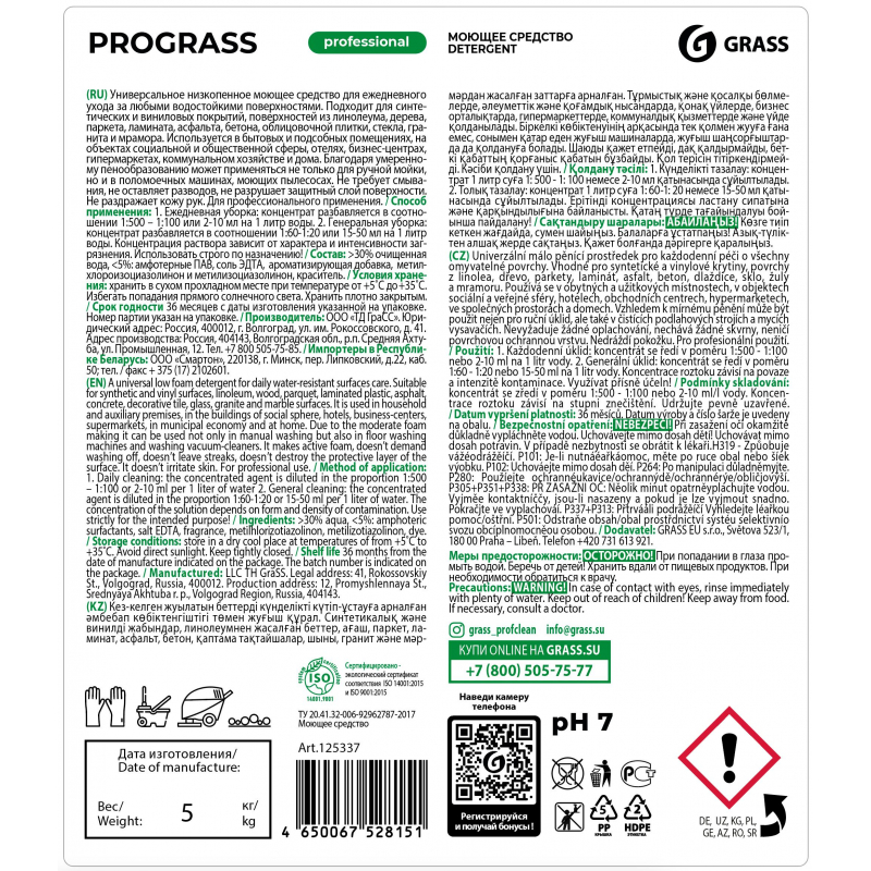 Универсальное моющее средство Grass Prograss 5 л (концентрат) Назначение: универсальное низкопенное концентрированное моющее средство для ежедневного ухода за любыми моющимися поверхностями. Используется в отелях, бизнес-центрах, гипермаркетах, на объектах социальной и общественной сферы, в коммунальном хозяйстве и дома. Подходит для синтетических и виниловых покрытий, поверхностей из линолеума, дерева, паркета, ламината, асфальта, бетона, облицовочной плитки, стекла, гранита и мрамора. Благодаря умеренному пенообразованию может применяться не только для ручной мойки, но и в поломоечных машинах. Не требует смывания, не оставляет разводов, не разрушает защитный слой поверхности. Не раздражает кожу рук. Способ применения: концентрация раствора зависит от характера загрязнения. Ежедневная уборка: концентрат разводят в пропорции 1:150 - 1:50 или 5-20 мл/л. Генеральная уборка: концентрат разбавляется в соотношении 1:35 - 1:15 или 30-60 мл/л. Срок годности рабочих растворов - не менее 7 суток. Состав: 30% очищенная вода; <5%: неионогенные ПАВ, амфотерные ПАВ, соль ЭДТА, ароматизирующая добавка, метилхлороизотиазолинон, метилизотиазолинон, краситель. Срок годности: 3 года при соблюдении условий хранения в невскрытой упаковке производителя. Относится к сегменту "суперэконом" - товар с минимальными требованиями к качеству для тех, кто хочет сэкономить. Товар отвечает основным потребительским характеристикам.