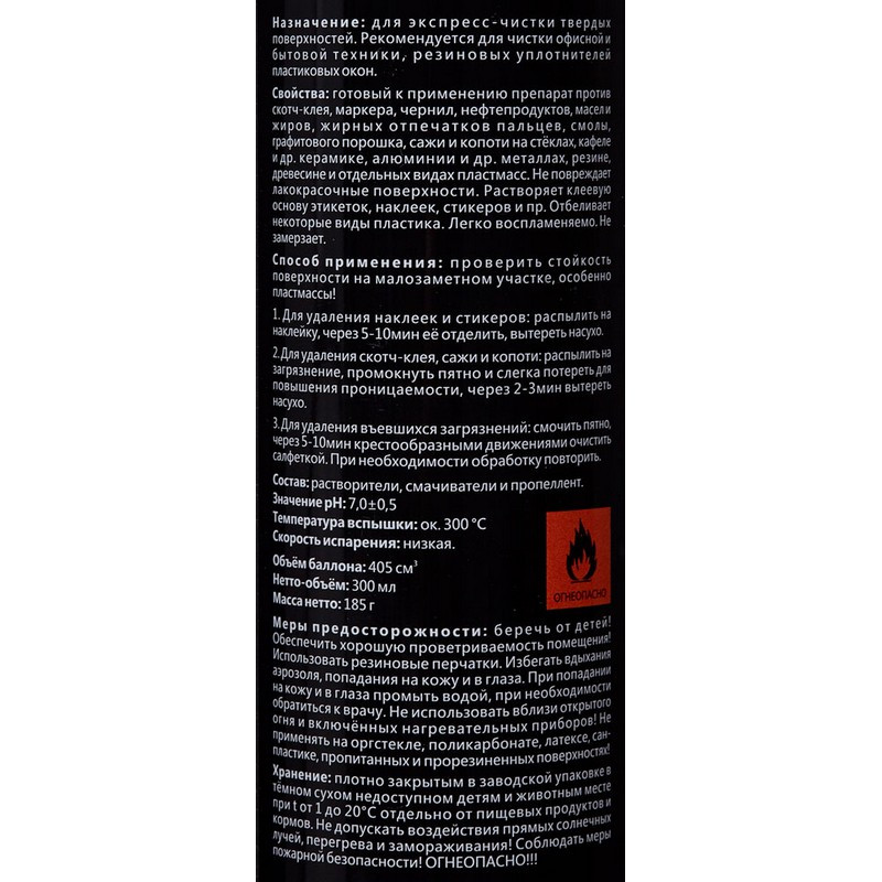 Универсальное чистящее средство на основе растворителей Pro-Bright Formula X-5 144-03 300 мл Назначение: для чистки различных поверхностей и для удаления наклеек различного типа. Рекомендуется для чистки пластиковых окон после их установки. Область применения: торговые и деловые центры, спортивно-оздоровительные, культурно-досуговые, медицинские, образовательные, научные, финансовые и иные учреждения, организации общественного питания, предприятия промышленности, гостиницы и вокзалы, все виды транспорта, в быту. Свойства: аэрозольный готовый к применению препарат против скотч-клея, маркера, чернил, нефтепродуктов, жиров и отпечатков пальцев, смолы, графитового порошка и сажи на стеклах, кафеле и др. керамике, камне, алюминии и др. металлах, отдельных видах пластика, деревянных и др. поверхностях. Не повреждает лакокрасочные поверхности. Растворяет клеевую основу этикеток, наклеек, стикеров и пр. Отбеливает некоторые виды пластика. Легко воспламеняемый. Не замерзает. Способ применения: обеспечить хорошую проветриваемость при работе в помещении! Проверить стойкость поверхности на незаметном участке, особенно пластика! 1. Для удаления наклеек и стикеров: распылить на наклейку, через 5-10мин ее отделить, вытереть насухо. 2. Для удаления скотч-клея, сажи и копоти: распылить на пятно и слегка потереть для повышения проницаемости, через 2-3мин вытереть насухо. 3. Для удаления въевшихся загрязнений: смочить пятно, через 5-10мин крестообразными движениями очистить салфеткой. При необходимости обработку повторить. Состав: пропеллент более 30%; терпен более 15%, но менее 30%; растворитель более 15%, но менее 30%; изопропанол более 5%, но менее 15%; нПАВ менее 5%. Плотность: 1,075+0,05 г/см при 20°С. Значение pH 1%-раствора: неприменимо. Меры предосторожности: (Более подробная информация в паспорте безопасности) Опасно! Беречь от детей! Применять строго по назначению указанными способами. При работе использовать резиновые перчатки. Избегать вдыхания при распылении, попадания на кожу и в глаза. При попадании на кожу и в глаза промыть водой, при необходимости обратиться к врачу. Не использовать вблизи открытого огня и включенных нагревательных приборов! Соблюдать меры пожарной безопасности! Огнеопасно! Не применять на оргстекле, поликарбонате, латексе, сан-пластике, пропитанных и прорезиненных поверхностях! Хранение: плотно закрытым в заводской упаковке в темном сухом недоступном детям и животным месте отдельно от пищевых продуктов и кормов. Не допускать воздействия прямых солнечных лучей и нагрева 30°С! Срок годности: 5 лет от даты изготовления (при соблюдении условий транспортировки и хранения).