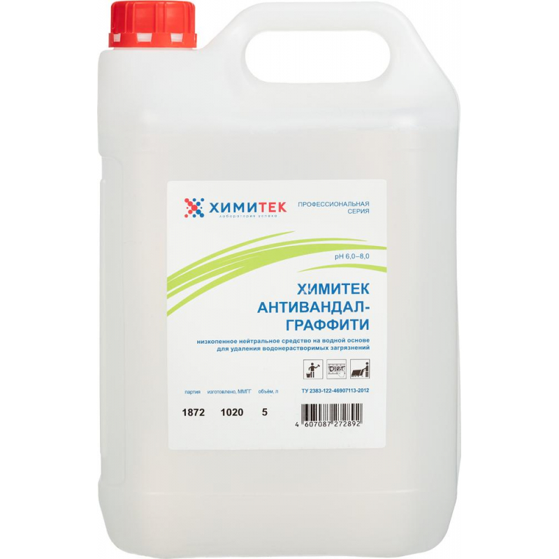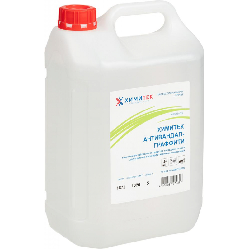Средство для удаления водонерастворимых загрязнений Химитек Антивандал-Граффити 5 л Назначение: предназначено для удаления с твердых поверхностей загрязнений от маркера, фломастера, чернил, отдельных видов лакокрасочных материалов, а также индустриальных масел и различных видов смазок. Рекомендуется для очистки бетонных и наливных полов, керамической плитки, линолеума от сажистых следов обуви и шин. Применяется для ручной и машинной технологии использования. Рекомендуется на предприятиях различного профиля, в том числе в ЛПУ, санаторно-курортных, детских, дошкольных, школьных и других аналогичных учреждениях, а также в быту.Не использовать для мойки изделий из оргстекла. Способ применения: Средство используют в виде концентрата или 5%-50% растворов, которые готовят в емкостях из любого материала добавлением концентрата в воду. Средство наносят методами протирания, орошения, замачивания. Температурный режим разведения и применения 5°C-35°C. Ориентировочный расход 30-50 г на 1 м.Загрязнения от маркера, фломастера, чернил удаляют салфеткой, пропитанной средством или его 50% раствором.Для удаления свеженанесенных лакокрасочных материалов рекомендованное время экспозиции 1-15 минут, затем размягченное загрязнение удаляют салфеткой или щеткой, поверхность ополаскивают водой.Для удаления следов резины, масел и смазок при ручном способе уборки средство применяют в виде концентрата, 5%-10% растворов - при машинном способе. Смывание производят через 1-10 минут, не допуская высыхания средства на поверхности. Срок годности рабочих растворов - не менее 7 суток. Меры предосторожности: избегать попадания средства в глаза и на кожу. При работе со средством рекомендуется пользоваться перчатками. Хранить в недоступном для детей месте.В случае попадания средства в глаза или на кожные покровы рекомендуется промывание проточной водой. При необходимости обратиться к врачу. Условия хранения:Хранить в закрытом виде в сухих крытых вентилируемых помещениях при температуре от 5°C до +35°C на расстоянии не менее 1 м от нагревательных приборов. Состав: Вода 30%, гликоли 30%, неионогенные ПАВ 5%, но <15%, предельные углеводороды <5%. Срок годности: 2 года при соблюдении условий хранения в невскрытой упаковке производителя.