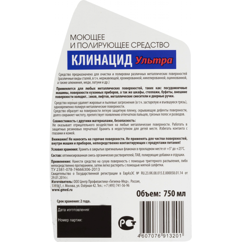 Профессиональное средство для мойки пищевого оборудования Клинацид Ультра 750 мл Назначение: Применяется для любых металлических поверхностей, таких как: посудомоечные машины, поверхности кухонных приборов, а так же шкафы, стеллажи, буфеты, внешние поверхности холодильников, лифтов, металлические смесители и дверные ручки. Средство хорошо удаляет жировые и пылевые загрязнения (в том числе застарелую и въевшуюся грязь), одновременно полируя металлические поверхности. Средство образует на поверхности легкую защитную пленку, скрывающую дефекты поверхности, долго сохраняет чистоту, препятствует появлению отпечатков пальцев, грязных полос и разводов. Способ применения: Нанести средство на сухую поверхность с помощью триггерного распыления, либо непосредственно протиранием, затем легко растереть с помощью мягкой салфетки. Меры предосторожности: Не наносить на горячие поверхности. Не применять для чистки поверхностей, внутри машин и приборов, непосредственно контактирующих с продуктами питания! Условия хранения: Хранить в закрытых оригинальных флаконах в прохладном месте, при температуре от 5 °С до 25 °С). Состав: Оптимизированная смесь органических растворителей, ПАВ, полирующие компоненты и отдушки. Срок хранения: 2 года.