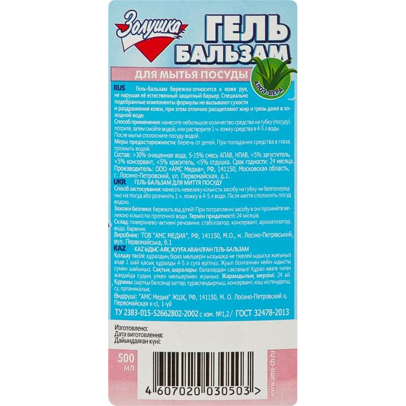 Средство для мытья посуды Золушка Алоэ вера 500 мл Назначение. Гель-бальзам бережно относится к коже рук, не нарушая ее естественный защитный барьер. Специально подобранные компоненты формулы не вызывают сухости и раздражения кожи, при этом отлично расщепляют жир и грязь даже в холодной воде. Способ применения. Нанесите небольшое количество средства на губку (посуду), потрите, затем смойте водой, или растворите 1 чайную ложку средства в 4-5 л воды. После мытья сполосните посуду водой. Меры предосторожности. Беречь от детей. При попадании средства в глаза промыть водой. Состав. >30% очищенная вода, 5-15% смесь АПАВ, НПАВ, <5% загуститель,<5% консервант, <5% краситель, <5% отдушка. Условия хранения. Хранить в сухом прохладном месте. Предохранять от попадания прямых солнечных лучей. Срок годности. 24 месяца. Относится к сегменту "суперэконом" - товар с минимальными требованиями к качеству для тех, кто хочет сэкономить.