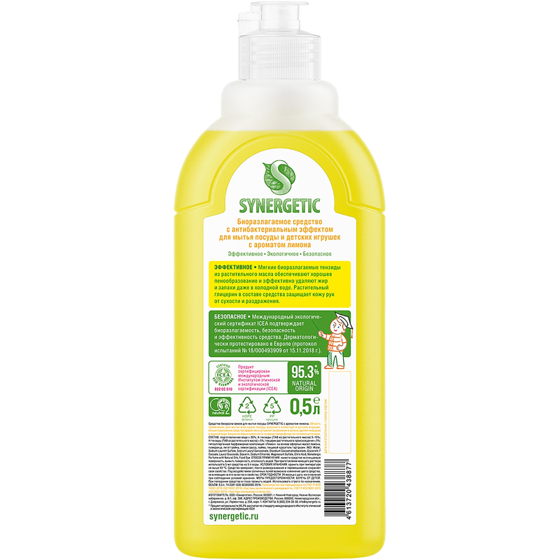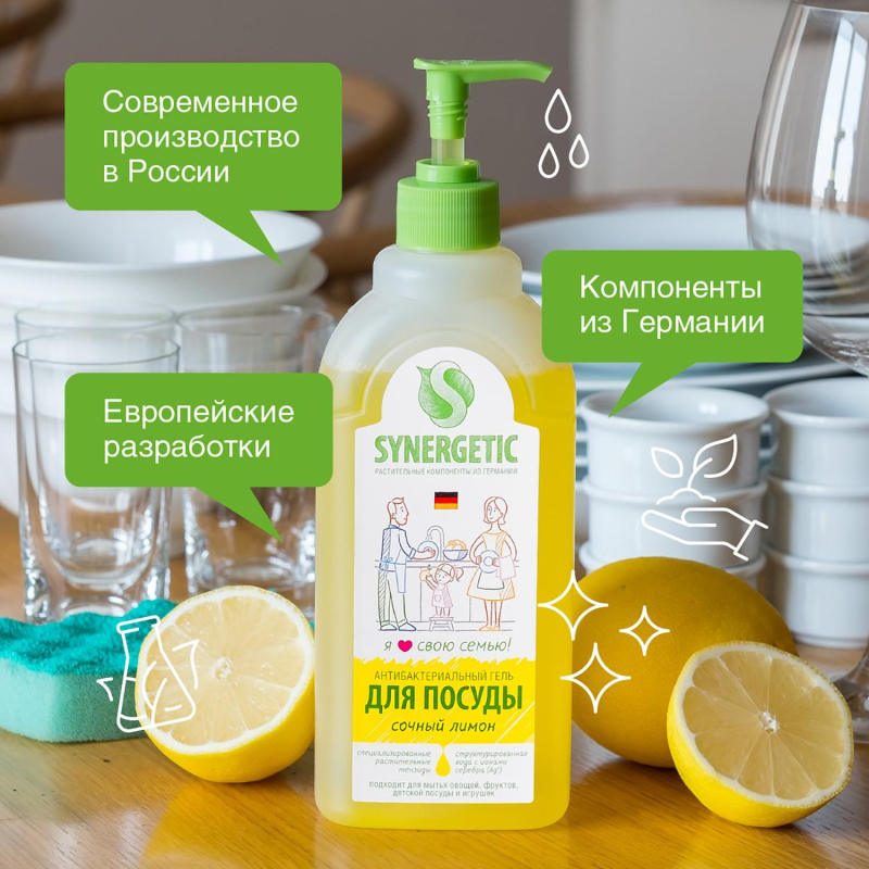 Средство для мытья посуды Synergetic с ароматом лимона 500 мл. Назначение. Концентрированное высокопенное средство предназначено для мытья всех видов посуды от любых видов загрязнений. 100% смываемость. Подходит для мытья фруктов, детской посуды и игрушек. Эффективно устраняет запахи, удаляет жир даже в холодной воде. В основе продукта растительные компоненты. Биоразлагаемый в воде. Не вредит микрофлоре септических установок для очистки сточных вод. Способ применения. Нанести средство на губку или посуду, потереть, ополоснуть водой. Меры предосторожности. Хранить в недоступном для детей месте. При попадании средства в глаза промыть водой. Состав. Дистиллированная вода >30%, А-тензиды (растительного происхождения) >5%, но <15%, Н-тензиды (на основе глюкозы) <5%, глицерин <5%, масла: лимона, лемонграсса, лайма; пищевой краситель. Условия хранения. Хранить в сухом прохладном месте. Предохранять от попадания прямых солнечных лучей. Срок годности. 24 месяца с даты производства. ТУ 2381-028-92383090-2016. Внимание! Вид упаковки может отличаться в зависимости от партии (либо помповый дозатор, либо флип топ).