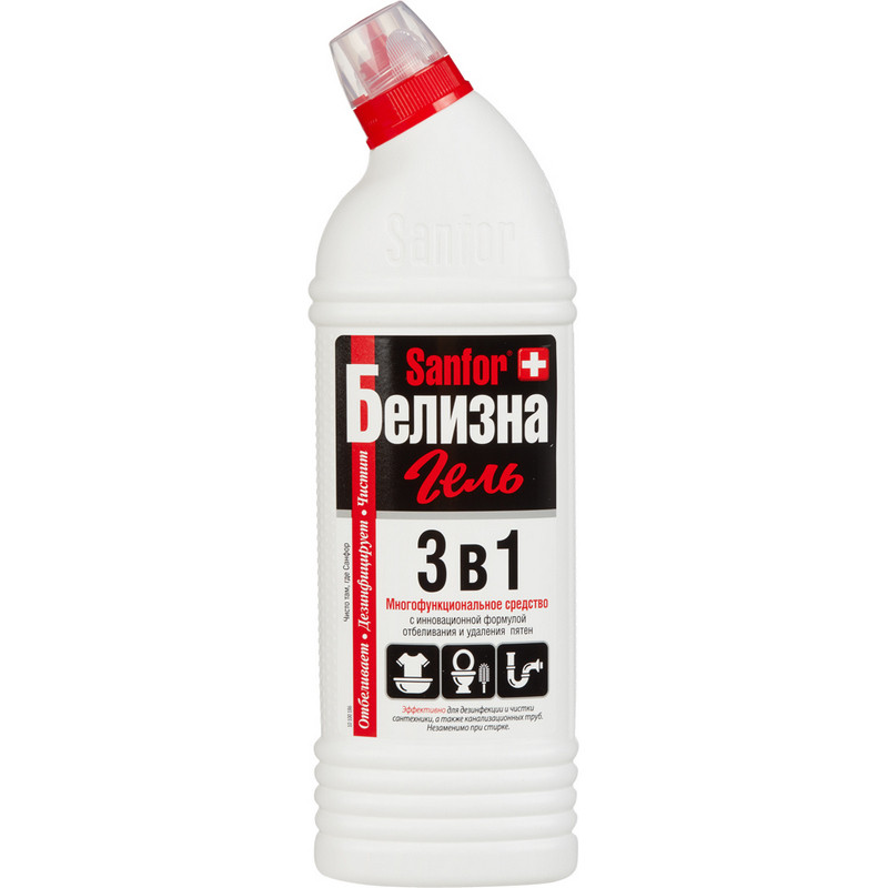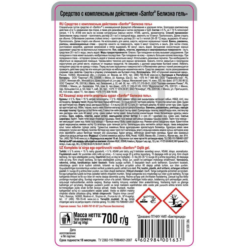 Отбеливатель Sanfor Белизна 3 в 1 гель 700 г (содержание хлора 5-15%) Назначение: средство предназначено для чистки и дезинфекции сантехники и труб, а также для замачивания белья перед стиркой и отбеливания. Способ применения: - Замачивание перед стиркой (белье с общим загрязнением): приготовить раствор - 20 г (2 колпачка) средства на 10 л холодной воды. Замочить на 10 минут, прополоскать. Далее стирать как обычно. - Отбеливание (наличие стойких пятен): приготовить раствор - 20 г (2 колпачка) средства на 10 л теплой (30°C-35°C) воды. Выдержать 40 минут, прополоскать. Далее стирать как обычно. НЕ использовать для шерсти и шелка, а также для непрочно окрашенных тканей. - Ванны, раковины, унитазы, керамическая плитка: нанести средство на поверхность, через 5 минут смыть. Для чистки стоков, уничтожения бактерий, удаления загрязнений и пятен выдержать 60 минут, смыть водой. - Пол, кафель, пластик, эмалированные поверхности: мыть раствором - 20 г (2 колпачка) средства на 5 л воды. Промыть поверхность водой. Меры предосторожности: при работе использовать резиновые перчатки. При попадании средства в глаза или на кожу промыть большим количеством воды, при необходимости обратиться к врачу. Хранить в недоступном для детей месте. Состав: гипохлорит натрия >5%, но <15%, анионные ПАВ или мыло на основе натуральных жирных кислот <5%, неионогенные ПАВ, щелочь, ароматизатор. Условия хранения: хранить в сухом прохладном месте в вертикальном положении. Предохранять от попадания прямых солнечных лучей. Срок годности: 18 месяцев с даты изготовления.