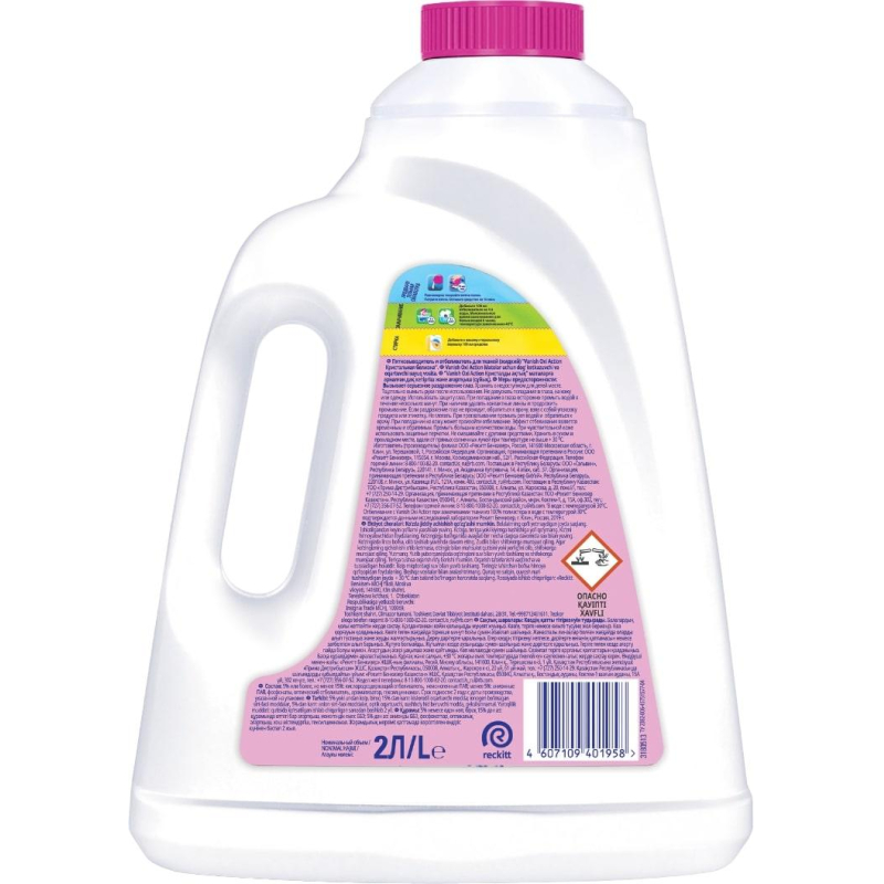 Пятновыводитель и отбеливатель для тканей жидкий Vanish Oxi Action Кристальная белизнаНазначениеСредство предназначено для удаления пятен с белых тканей и отбеливания. Эффективно в горячей и холодной воде.НЕ использовать для цветных тканей!Способ применения- Стирка: добавить 100 мл средства к стиральному порошку.- Замачивание: развести 100 мл средства в 4 л воды при температуре не выше 40°C. Оставить замачиваться белье не более чем на 6 часов. После замачивания стирать как обычно или тщательно прополоскать. Для лучшего результата потереть пятна перед полосканием.- Предварительная обработка: нанести 20 мл средства на пятно. Потереть пятно.Меры предосторожностиМожет вызвать раздражение глаз и кожи. Рекомендуется мыть руки после использования или работать в перчатках. Не использовать вместе с хлорсодержащими веществами. Беречь от детей. Не допускать высыхания на ткани. Не использовать, если рекомендована сухая чистка. Для изделий с нестойкими красками рекомендуется сначала проверить прочность окрашивания. Не использовать на мраморных, металлических и эмалированных поверхностях. Избегать попадания на металлические пуговицы и пряжки.Состав5-15%: кислородосодержащий отбеливатель, неионогенные ПАВ; менее 5 %: анионные ПАВ, фосфонаты; оптический отбеливатель, ароматизатор, гексилкоричный альдегид, d-лимонен.Условия храненияПредохранять от воздействия прямых солнечных лучей и нагревания выше 40°C.Срок годности18 месяцев с даты производства.