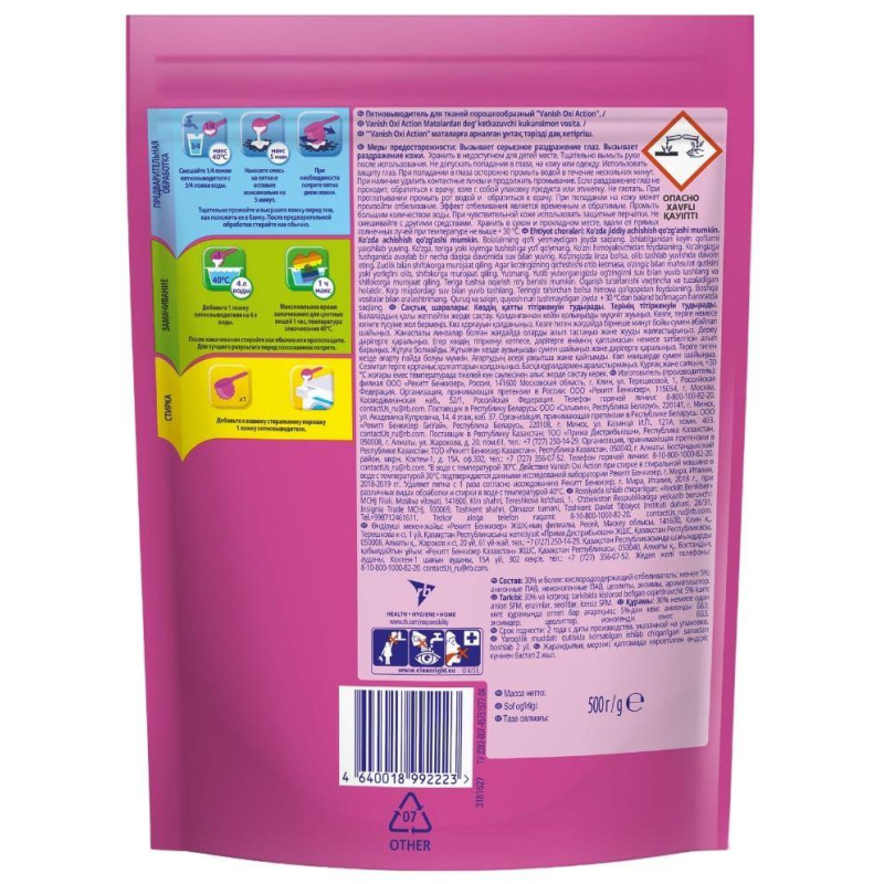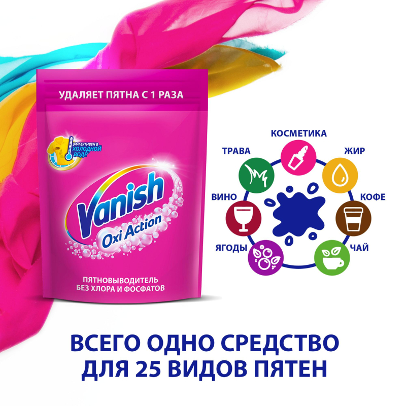 Пятновыводитель Vanish Oxi Action порошок 500 г Назначение Пятновыводитель и отбеливатель для тканей порошкообразный. Эффективен в холодной воде, удаляет пятна с первого раза. Не содержит хлор. Способ применения Предварительная обработка: смешайте 1/4 пятновыводители с 3/4 ложки воды. Нанесите смесь на пятно и оставьте максимально на 5 минут. После предварительной обработки, стирайте как обычно. Замачивание: добавьте 1 ложку пятновыводителя на 4 л воды. После замачивания стирайте как обычно или прополощите. Стирка: добавьте к вашему стиральному порошку. Для въевшихся и засохших пятен - 1 ложка. Для повседневных пятен - 1/2 ложки пятновыводителя. Меры предосторожности При попадании на кожу промыть большим количеством воды с мылом. При попадании в глаза осторожно промыть водой в течение нескольких минут. При наличии удалить контактные линзы и продолжить промывание. Немедленно обратитесь к врачу. Если раздражение глаз не проходит, обратиться к врачу, взяв с собой упаковку продукта или этикетку. Не глотать. При попадании в полость рта обратиться к врачу. Хранить в сухом и прохладном месте. Состав 30% и более: кислородсодержащий отбеливатель; менее 5%: анионные ПАВ, неионогенные ПАВ, цеолиты, энзимы, ароматизатор. Условия хранения Хранить в месте не доступном для детей. Срок хранения 2 года.