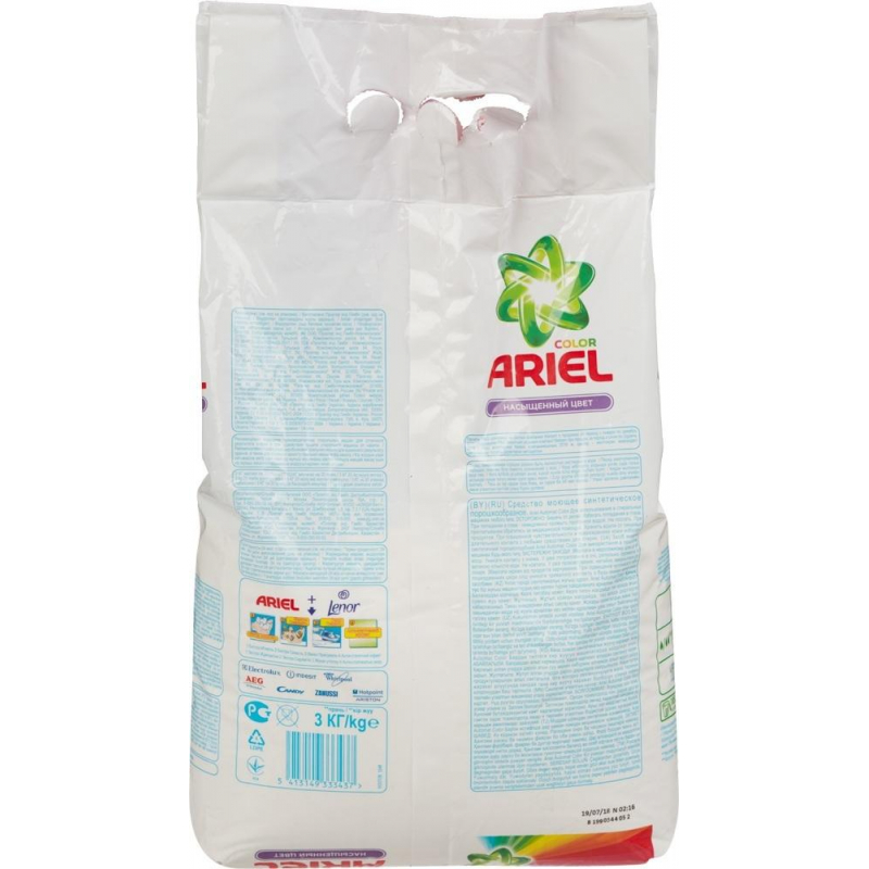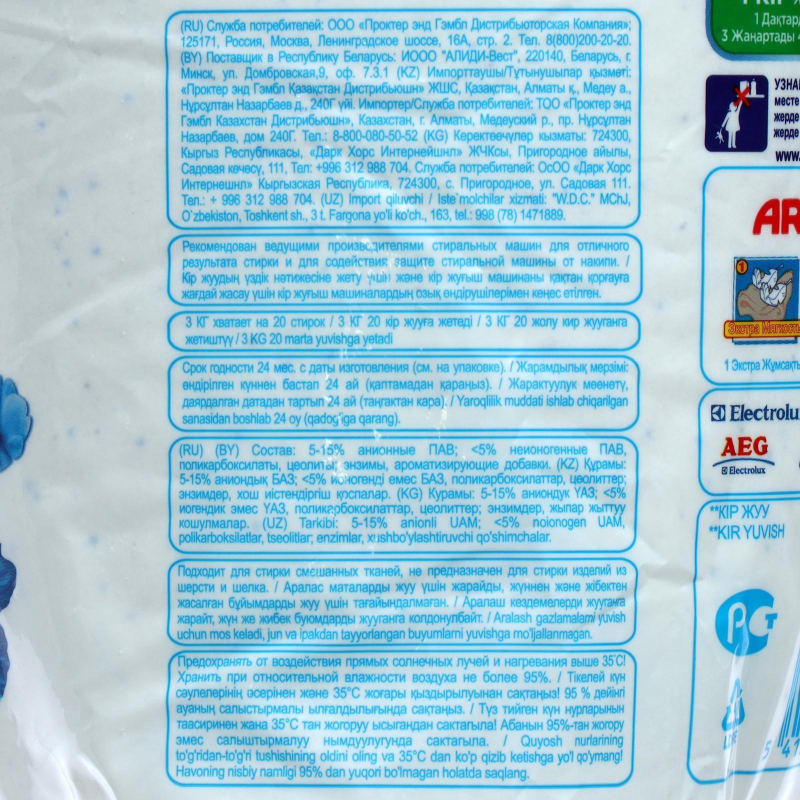 Порошок стиральный автомат Ariel Color для цветного белья 3 кг (отдушки в ассортименте). Назначение: стиральный порошок Ariel Color предназначен для стирки в стиральных машинах любого типа. Он эффективно отстирывает различные пятна. Порошок содержит особые ингредиенты, которые помогают сохранить цвета ткани во время стирки и придают свежесть вещам. Стиральный порошок отлично отстирывает даже в холодной воде, так как содержит специальные энзимы, которые начинают работать уже при низких температурах. Порошок содержит компоненты, помогающие защитить стиральную машину от накипи и известкового налета. Способ применения: насыпьте необходимое количество порошка в соответствующее отделение стиральной машины перед началом стирки. Подробная информация о дозировке указана на упаковке. Меры предосторожности: беречь от детей. Избегать попадания в глаза. При попадании в глаза -немедленно промыть проточной водой. Не глотать. При проглатывании обратитесь за медицинской помощью. Хранить вдали от пищевых продуктов. При повышенной чувствительности и повреждениях кожи избегать длительного контакта с любыми средствами для стирки. Состав: 5-15% анионные ПАВ, <5% неионогенные ПАВ, отбеливающие вещества на основе кислорода, поликарбоксилаты, цеолиты, энзимы, оптические отбеливатели, ароматизирующие компоненты. Условия хранения: хранить в недоступном для детей месте. Срок годности: 2 года.