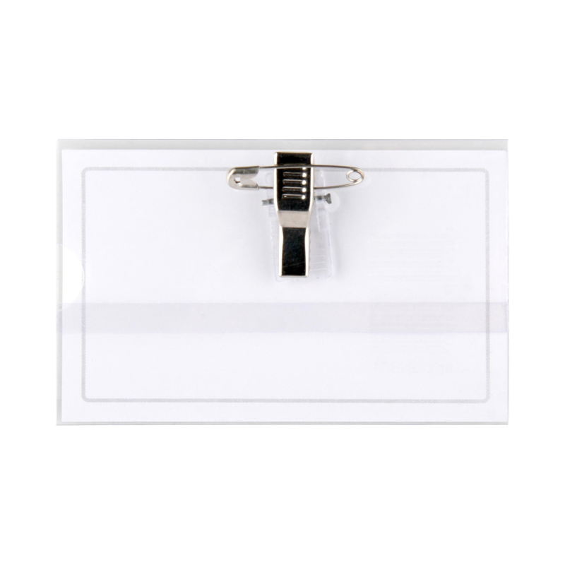 Бейдж горизонтальный, изготовлен из прозрачного пластика. Плотность пластика - 18 мкм. Размер бейджика - 90x55 мм. Имеют два держателя - булавку и зажим. Подходят для ношения именных карточек и пропусков. Поставляется в упаковке в количестве 50 штук.