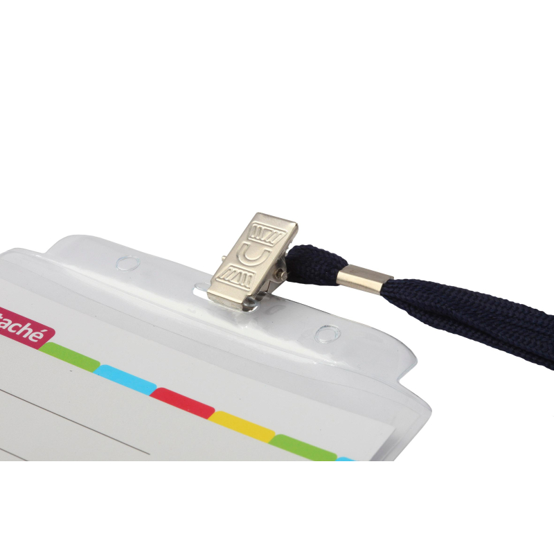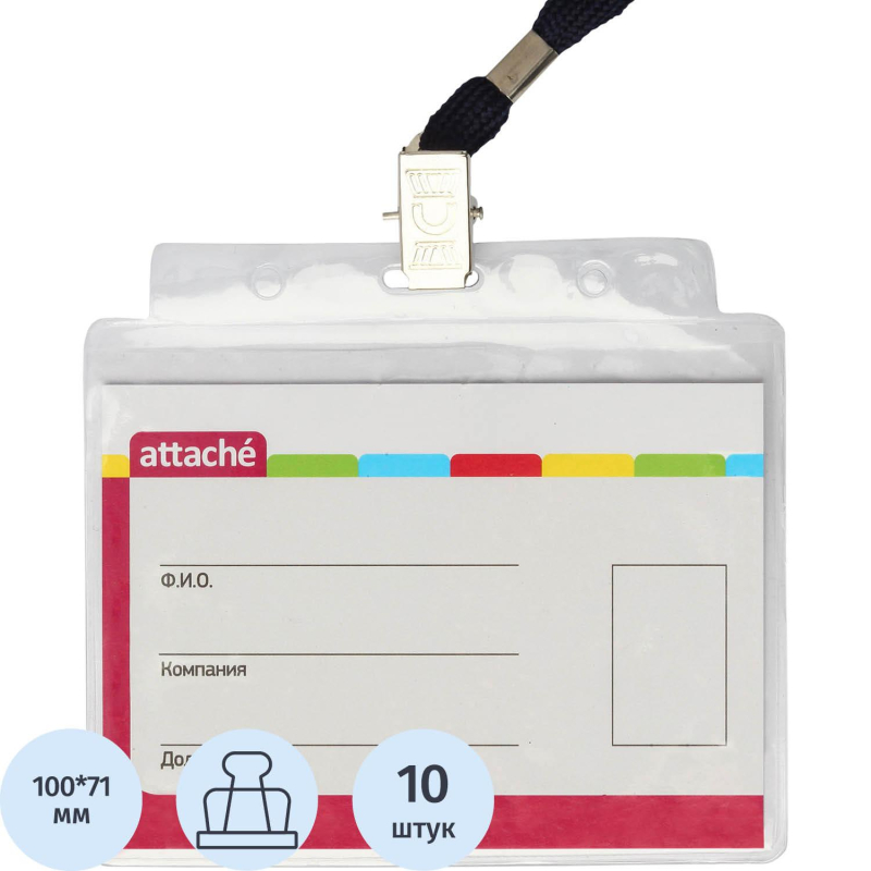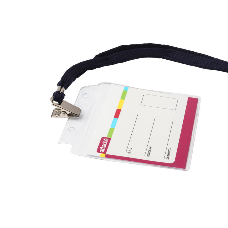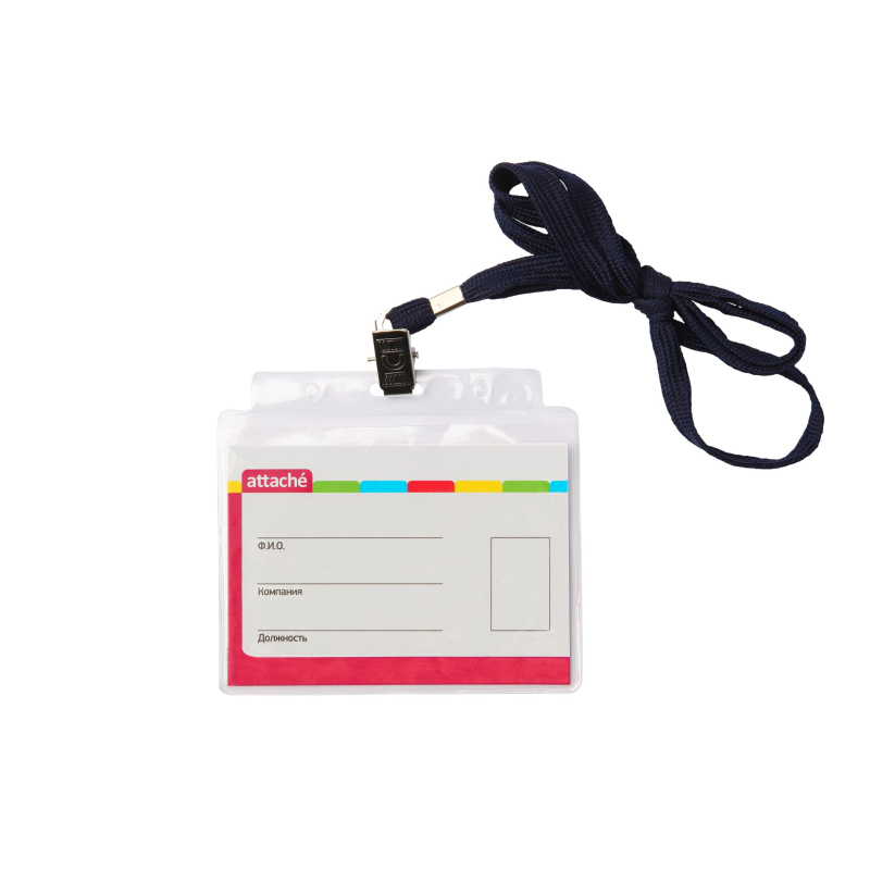 Бейдж Attache горизонтальный прозрачный выполнен из мягкого пластика. Размер бейджа - 107x83 мм, размер вкладыша - 100x71 мм. Крепление изделия осуществляется при помощи металлического зажима на тесьме. Ширина тесьмы - 10 мм, длина - 90 см. Бейдж подходит для ношения именных карточек и пропусков на семинарах, конференциях, выставках и других мероприятиях. Поставляется по 10 штук в упаковке. Цвет: черно-синий.