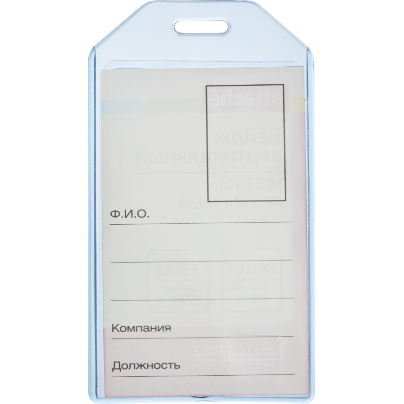 Бейдж Attache вертикальный, прозрачный, выполнен из мягкого пластика. Размер бейджа - 58x104 мм, размер вкладыша - 53x83 мм. Подходит для ношения именных карточек и пропусков на держателе с рулеткой или тесьмой. Предназначен для использования на семинарах, конференциях, выставках и других мероприятиях. Поставляется в упаковке по 10 штук.Бейдж может поставляться без вкладыша.