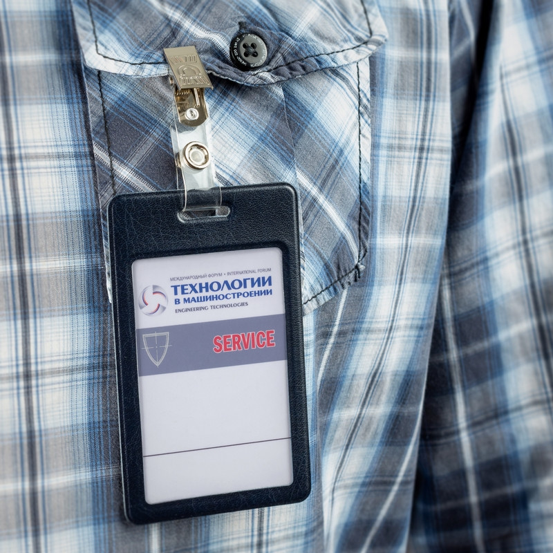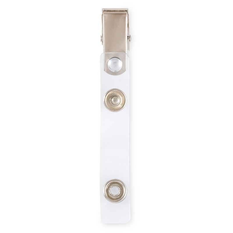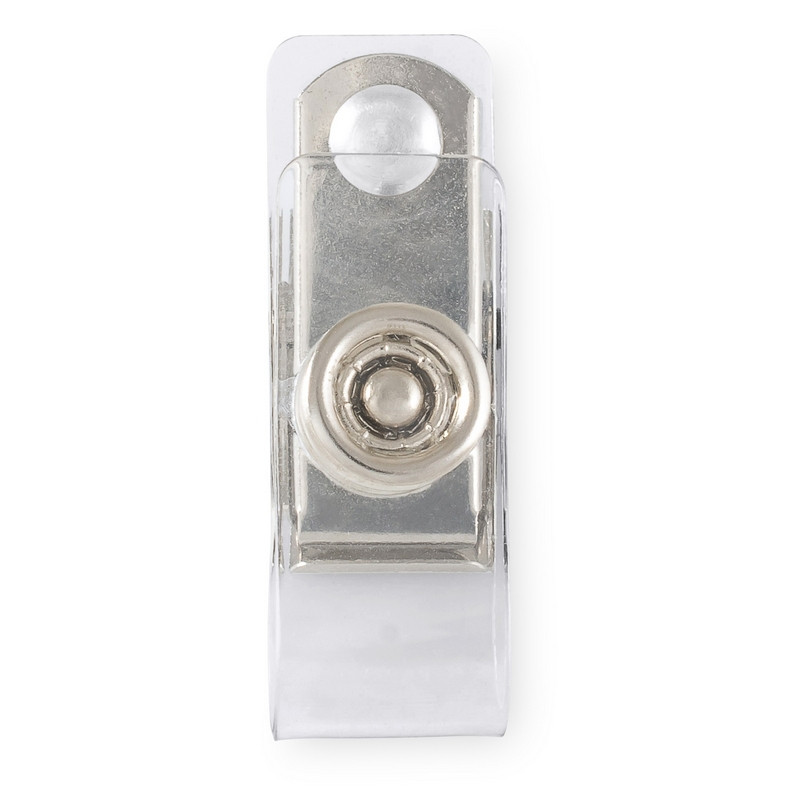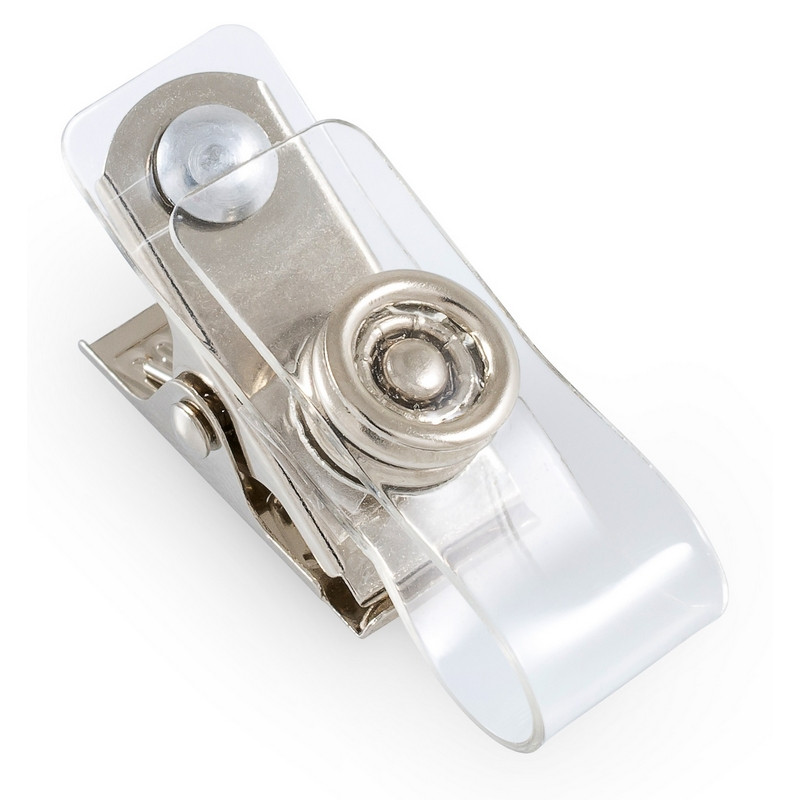Металлическая клипса с прозрачным держателем для крепления бейджей. Клипса крепится на карман или одежду. Поставляется в упаковке по 10 штук.