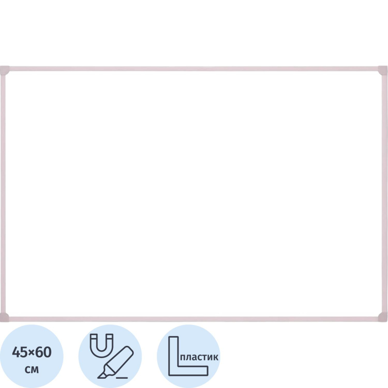 Доска 45x60 см настенная магнитно-маркерная лаковое покрытие в ПВХ-профиле белого цвета с пластиковыми уголками. Основа доски - ППС+HDF общей толщиной 10 мм. Скрытое крепление к стене при помощи четырех пластиковых кронштейнов. Набор для крепежа и полочка для маркеров в комплекте. Упаковка - коробка из трехслойного гофрокартона. Доска предназначена для письма маркерами сухого стирания для белых досок и размещения информации на бумажных носителях при помощи магнитов. Увеличенное рабочее пространство и облегченная конструкция за счет использования утонченной рамы из ПВХ шириной 11 мм. Товар относится к ценовому сегменту "суперэконом". Имеет упрощенные характеристики и более простую упаковку. Отвечает основным требованиям потребления. Размер рабочей поверхности: 41.8x55.8 см. Для удаления пленки потяните за верхний свободный угол, пленка легко отойдет от рабочей поверхности. При необходимости проведите вдоль рамы канцелярским ножом.