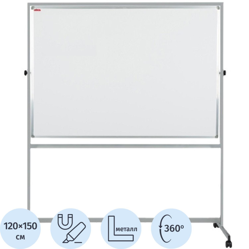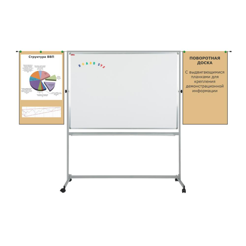 Поворотные доски - это серия аудиторных досок с оборотом вокруг горизонтальной оси на мобильной подставке. Основное предназначение - это наглядная демонстрация и обучение в условиях, когда существует необходимость частого перемещения доски. Эти доски были тщательно спроектированы и проверены лучшими специалистами в этой области. Благодаря этому можно заранее подготовить содержание доклада, наглядную демонстрацию и тем самым исключить возможность ошибки при передаче информации. Поверхности поворотных досок отличаются по предназначению: белая - для написания сухостираемыми маркерами, зеленая - для написания мелом. Поворот на 360 градусов. Покрытие: лаковое. Данная модель оснащена дополнительными планками для демонстрации наглядных пособий при помощи магнитов, что позволяет увеличить объем визуальной информации без потери основной пищущей поверхности. Съемная полочка для маркеров, размером 350 мм. Размер изделия - 120x150 см. Общая высота доски (с роликами) - 190 см. Длина планок максимально 90 см. Размер рабочей поверхности
