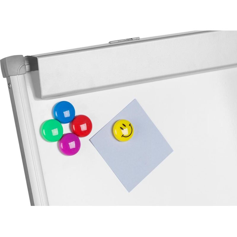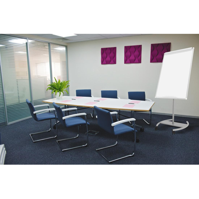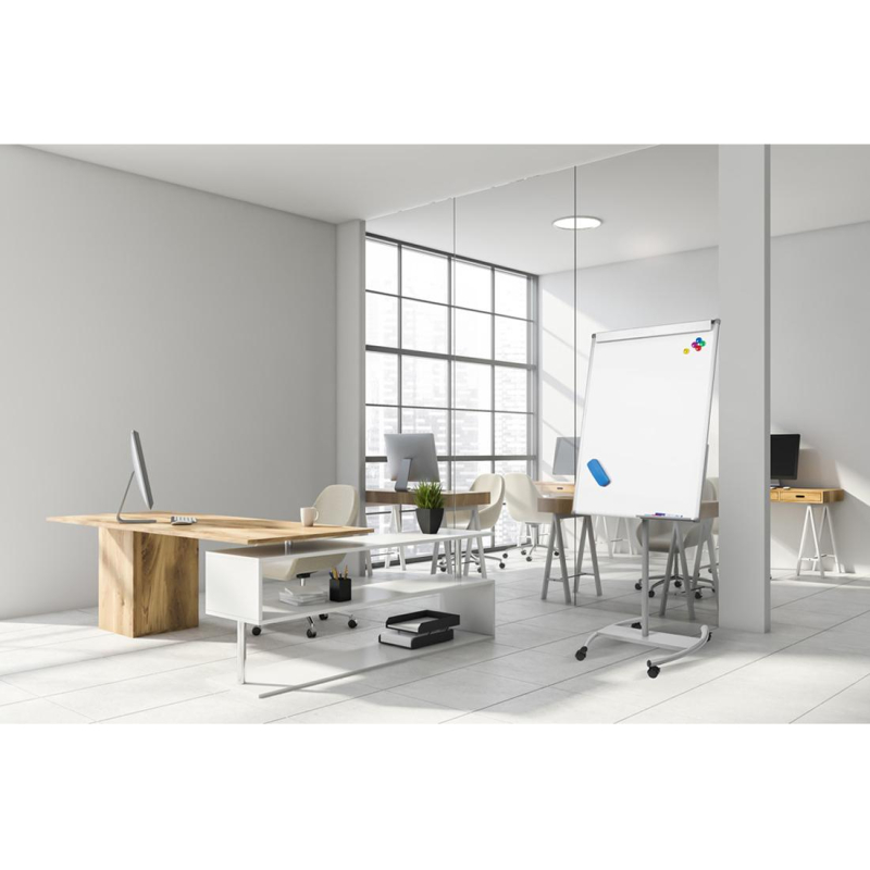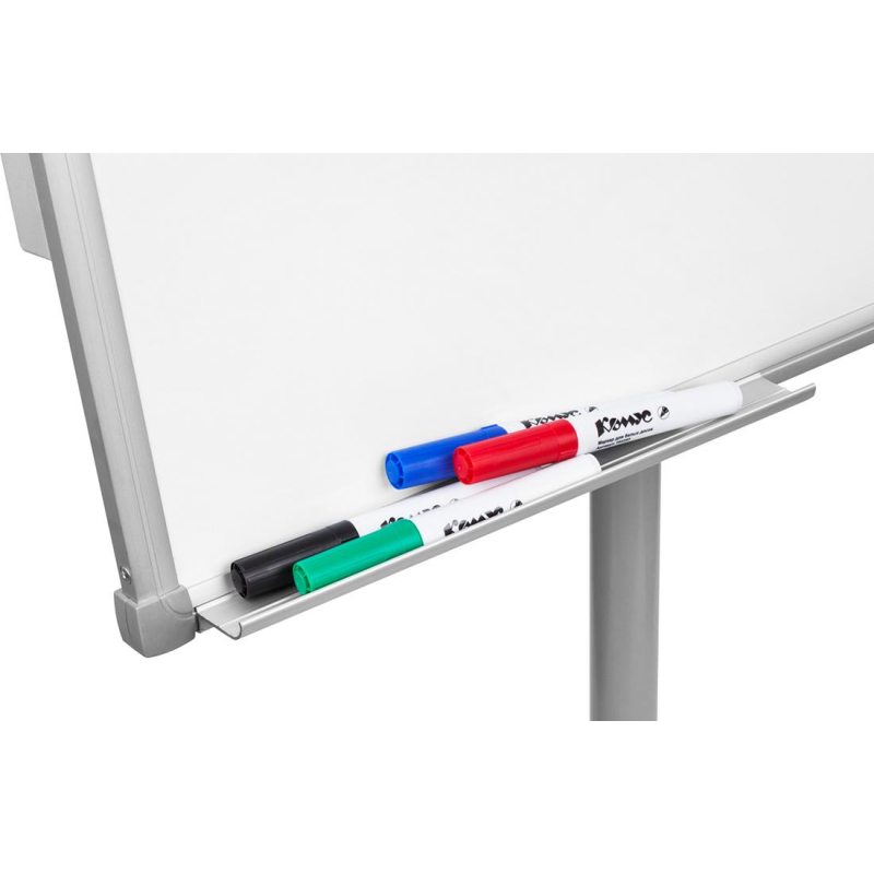 Мобильный флипчарт с магнитно-маркерным покрытием. Предназначен для работ маркерами сухого стирания и размещения информации с помощью магнитов. Флипчарты являются эффективными удобным средством для презентации, конференций. Рамка из анодированного алюминия и пластиковые уголки. Держатель для бумажного блока на винтах. Стильная мобильная подставка стального цвета на колесиках с механизмом фиксации. В комплект поставки входит лоток для маркеров. Размер поверхности 70x100 см. Флипчарт используется только вертикально. Угол наклона изменить нельзя. По высоте не регулируется, закреплен на высоте 79.5 см от пола, общая высота 187 см. По поверхности флипчарта рекомендуется писать маркерами для досок. По поверхности блока бумаги рекомендуется писать маркерами для флипчартов. Страна производитель - Россия. Гарантия 1 год. Расстояние между колесами: расстояние 55 см (разные дуги), 45 см (на одной дуге). Для удаления пленки потяните за верхний свободный угол, пленка легко отойдет от рабочей поверхности. При необходимости проведите вдоль рамы канцелярским ножом.