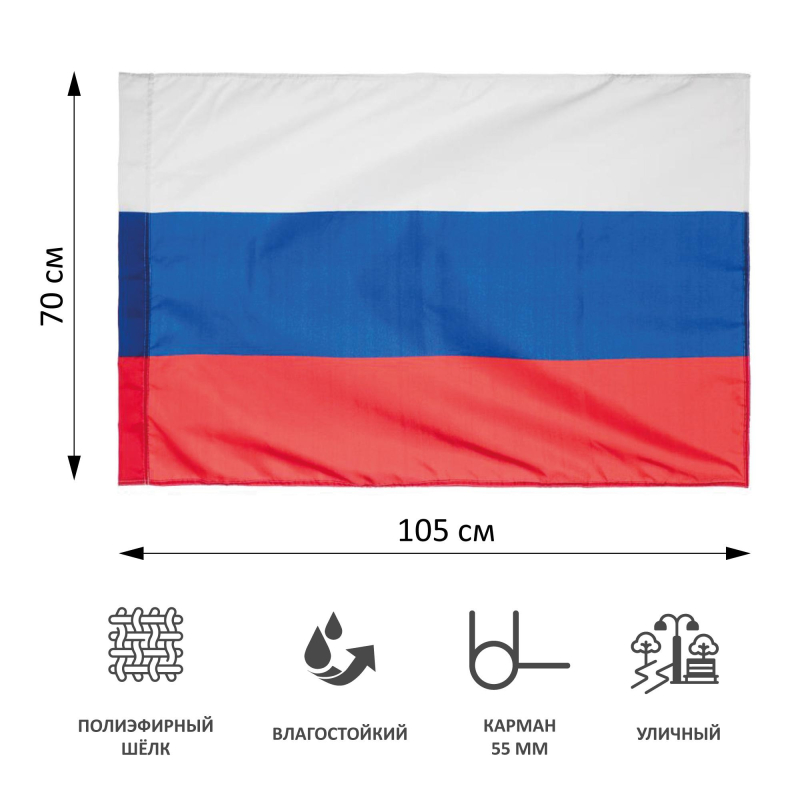 Флаг РФ используется органами государственной власти Российской Федерации, дипломатическими и иными официальными представительствами России за рубежом, воинскими подразделениям, на судах, включенных в один из реестров судов России, и военных кораблях России, а также гражданами при участии в торжественных и праздничных мероприятиях. Хороший сувенир ко Дню Победы. Размер: 70x105 см. Размер ?кармашка?: 25 мм. Материал: шелк. Флагшток в комплект не входит.