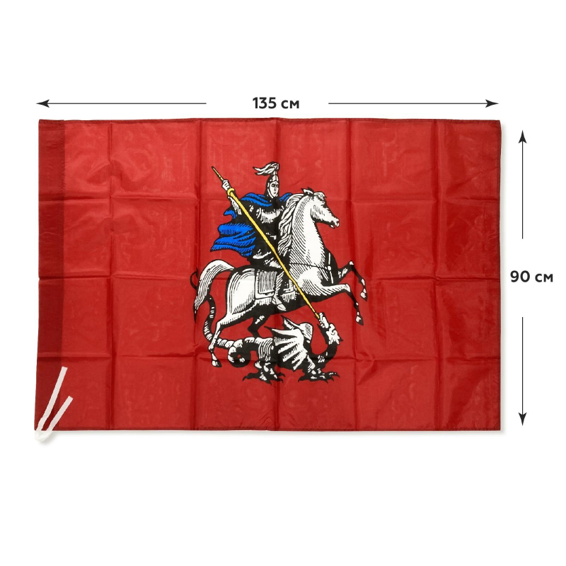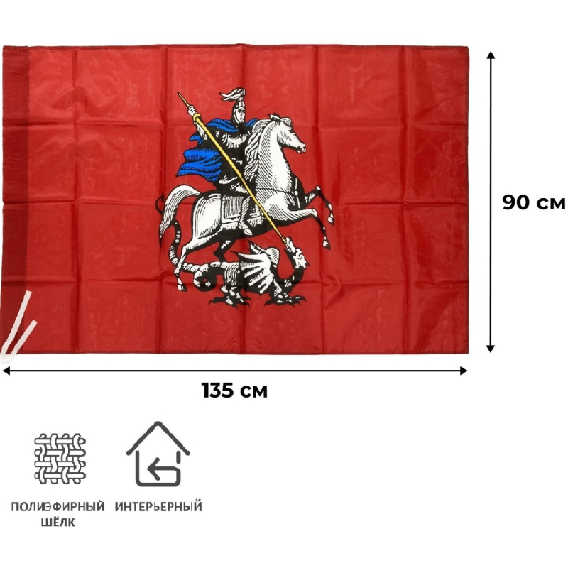 Флаг Москвы - официальный государственный символ города. Изображение Георгия Победоносца на серебряном коне в лазоревой мантии-приволоке, серебряных доспехах, поражающего черного змея золотым копьем, на полотнище темно-красного цвета. Изображение с одной стороны. Размер: 90x135 см. Размер ?кармашка?: 25 мм. Материал: шелк. Хороший сувенир ко Дню Победы. Флагшток в комплект не входит.