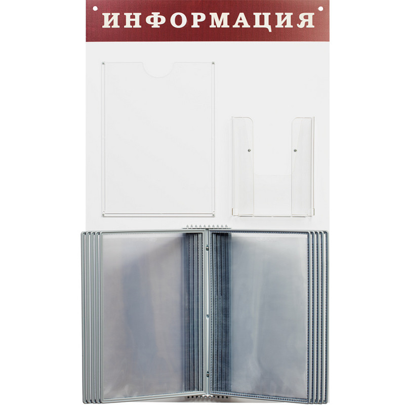 Информационный настенный стенд 'Информация' предназначен для размещения информации для покупателей, посетителей, сотрудников и т. д. Изготовлен из матового пластика белого цвета, размер - 48x80 см. Аппликация букв выполнена темно-вишневой пленкой. На стенде размещены прозрачные карманы формата А4 (под один лист) и формата А5 (объемный) глубиной 30 мм, а также перекидная демосистема на 10 панелей. В комплект входят крепежные элементы.