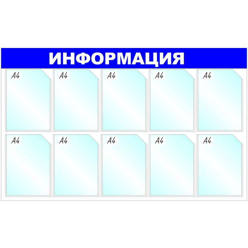 Информационный стенд на 10 плоских карманов под лист формата А4. Шапка Информация синего цвета, буквы белые. Основание стенда - ПВХ 4 мм., заголовок - цветная ПВХ плёнка шириной 10 см., 10 плоских карманов под формат А4, изготовленных из ПЭТ 0.5 мм. Крепление стенда к стене по четырем углам, набор крепежа (4 самореза) в комплекте. Упаковка - гофрокартон.