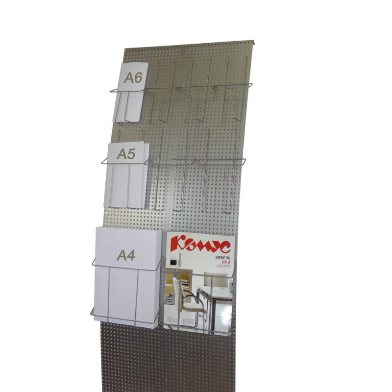 Буклетница напольная для полиграфии и информации изготовлена из металлического перфорированного листа и профиля 20х20 мм. Покрытие из порошковой эмали цвета хром. Размеры стойки - 160х45,7х36 см. Съемное основание делает ее удобной для транспортировки. Стойка поставляется без навесных элементов. Отдельно можно приобрести карманы различного формата: арт. 172258, 172259, 373189, 373190, 373191.