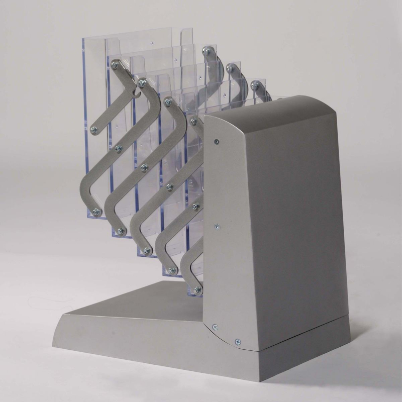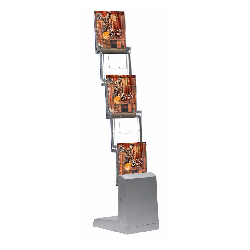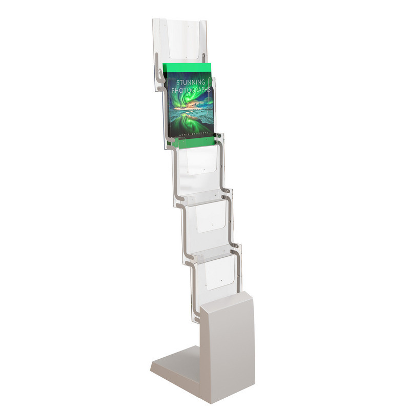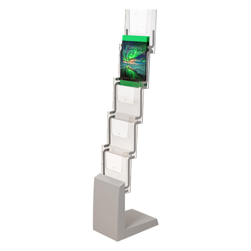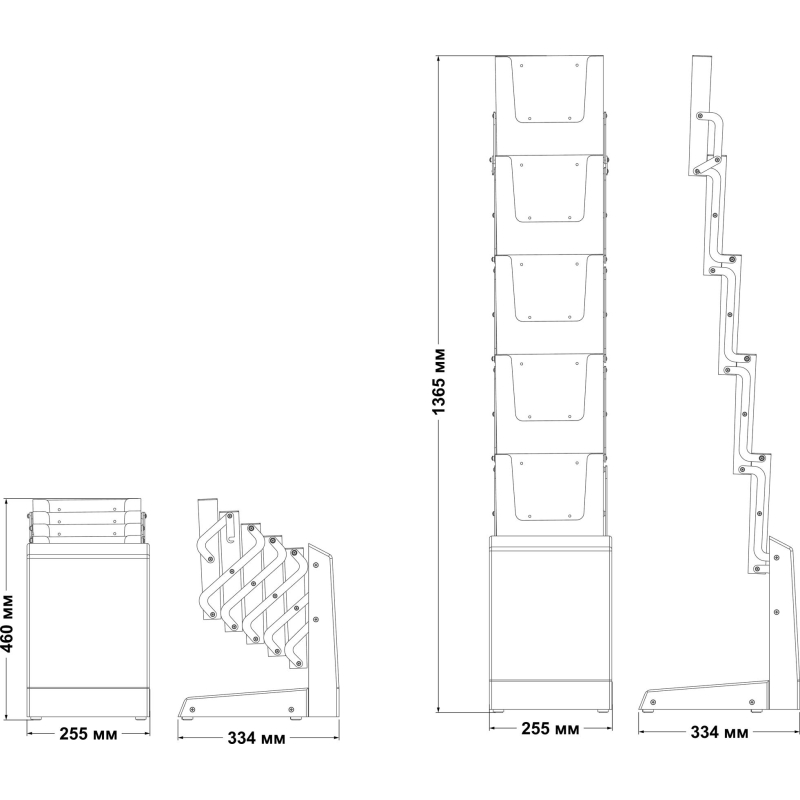 Буклетница для печатной продукции. Вид: напольная, складная, литьевая. Размер изделия 1345x255x334 мм: 1345 мм - длинна, 255 - ширина и 343 - глубина. Материал: металл, ППС. Материал основания - АБС, металл. Материал карманов - литьевой полистирол. Материал креплений - металл. Карманы: 5 карманов-полок под формат А4. Глубина кармана 4 см, стойка рассчитана на бумажную продукцию, которая уместится в данный карман. Комплект: стойка, сумка. Размер в собранном виде: 445x340 мм. Глубина стойки в раскрытом виде: 31.5 см. Упаковка: 1 шт. Вес: 2 кг. Размер вертикальной панели 34x25 см.