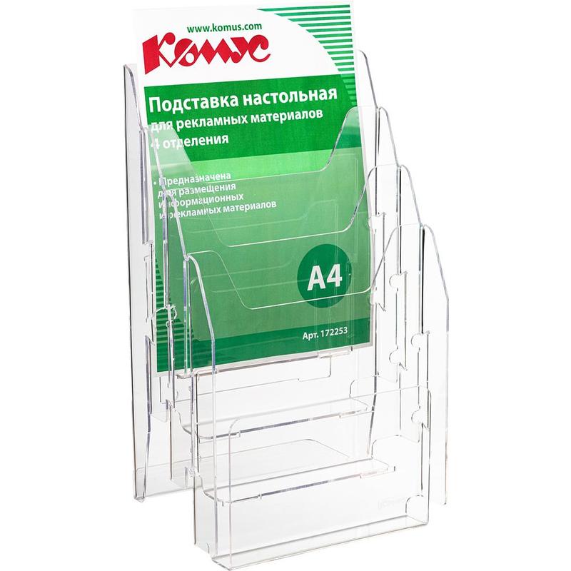 Вертикальная односторонняя настольная подставка со смещением Комус. Имеет четыре отделения. Предназначена для хранения буклетов, каталогов, документации на рабочем столе, изготовлена из прозрачного акрилового стекла. Глубина одного кармана 30 мм. Размеры (ВхШхГ): 360x222x200 мм.