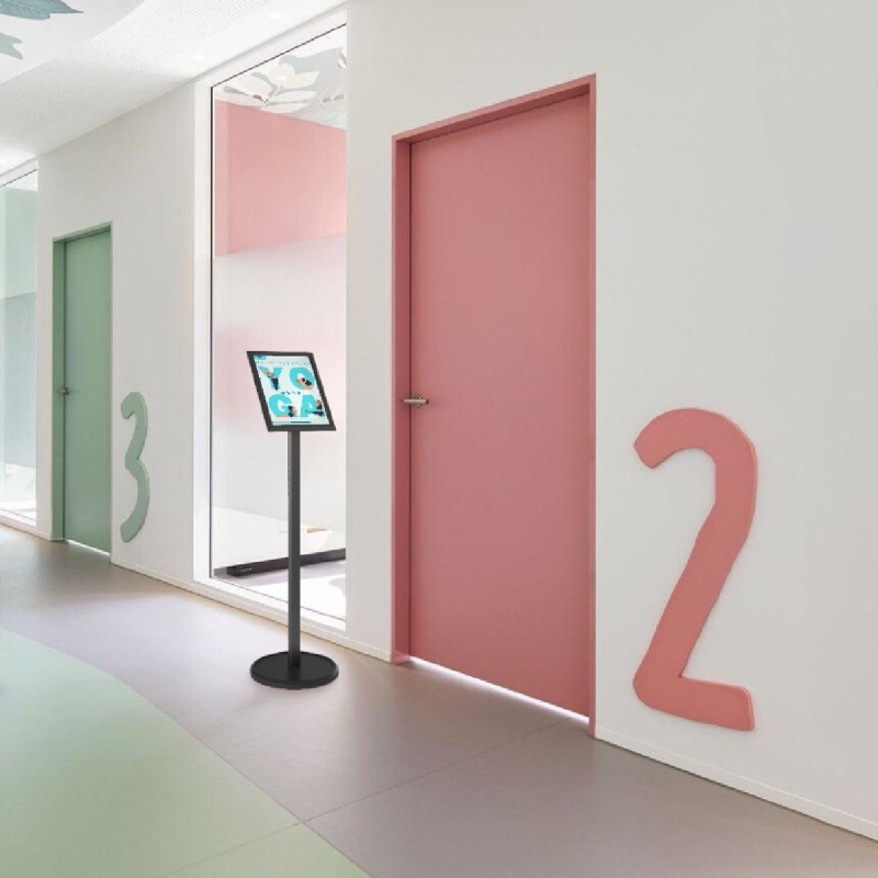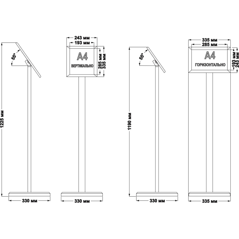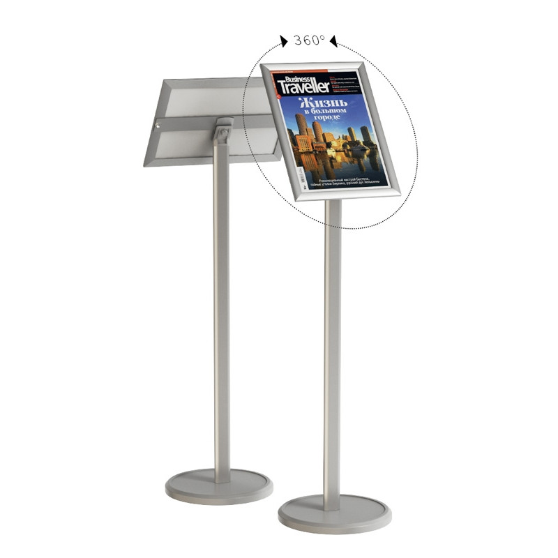 Напольная стойка предназначена для размещения информации размера А4. Универсальность (размещение возможно как горизонтально, так и вертикально) достигается засчет поворотного механизма. Информация крепится с помощью клик-рамки. Рамка скрывает по 10мм по периметру листа. Высота стойки 1200 мм.