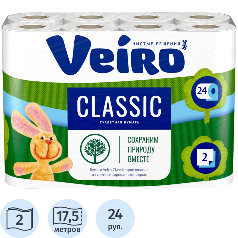 Бумага туалетная Veiro Classic 2-слойная белая (24 рулона в упаковке).Мягкая двухслойная туалетная бумага Veiro Classic белого цвета с декоративным тиснением и перфорацией отличается мягкостью. Быстро растворяется в воде. Рулон на втулке. В каждом рулоне - 140 листов. Тиснение способствует лучшей впитываемости, а перфорация позволяет использовать бумагу более экономно. Изготовлена из вторичной целлюлозы. Поставляется упаковками по 24 рулона.