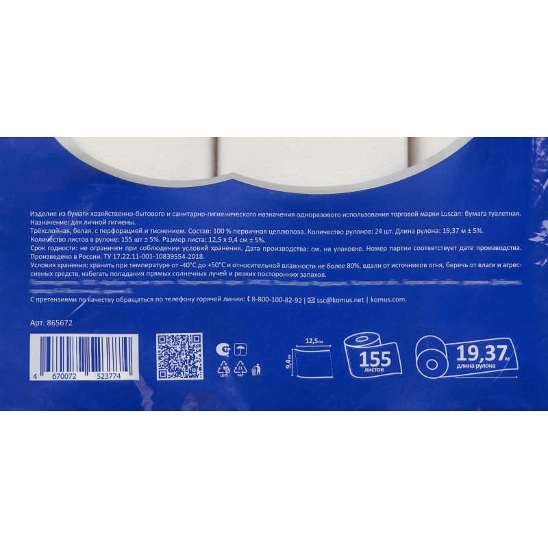 Бумага туалетная Luscan Deluxe 3-слойная белая (24 рулона в упаковке).Трехслойная туалетная бумага Luscan Deluxe белого цвета с тиснением и перфорацией. Отличается мягкостью и прочностью. Тиснение способствует лучшей впитываемости, а перфорация позволяет использовать бумагу более экономно.Изготовлена из 100% целлюлозы. Поставляется упаковками по 24 рулона.