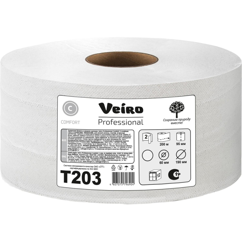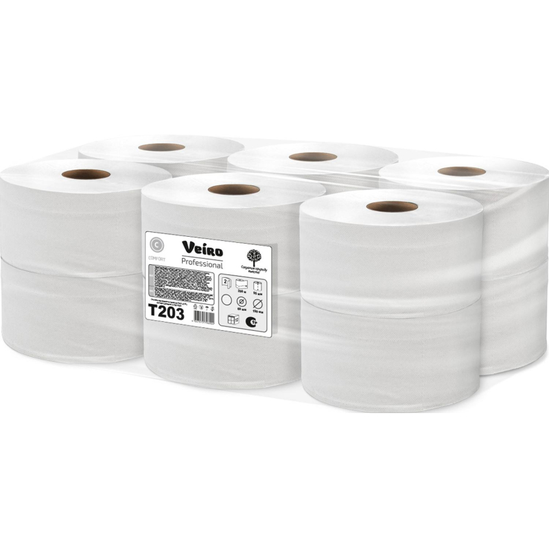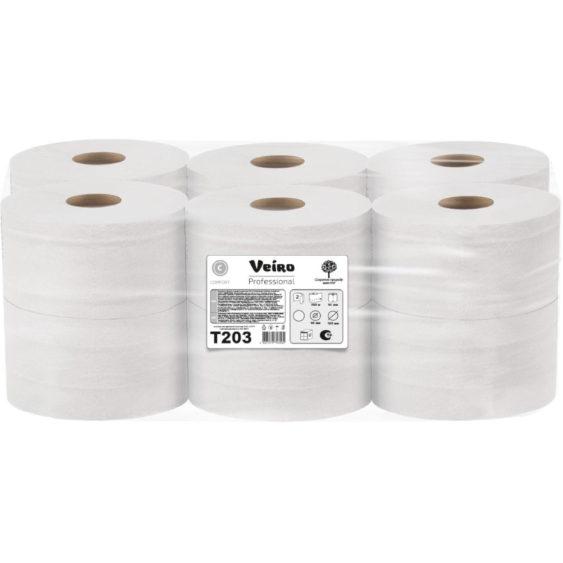 Бумага туалетная в рулонах Veiro Q2 Comf 2-слойная 12 рулонов по 200 метров (артикул производителя Т203) Рулонная туалетная бумага Veiro Professional Comfort идеально подходит для использования в местах со средней и высокой проходимостью, таких как ресторан, офис, торговый центр, аэропорт, ж./д. вокзал и т.д. Линия Veiro Professional Comfort - продукция для ежедневного применения, гарантирует хороший уровень эффективности и отличное соотношение цены и качества. 1600 листов в рулоне. Цвет белый. Изготовлена из вторичного сырья. Размер: длина рулона 200 м, ширина рулона 9,5 см, диаметр рулона 19,5 см, диаметр втулки 6 см