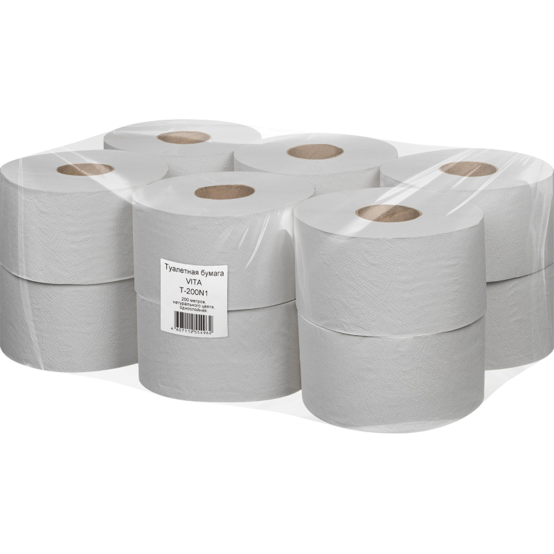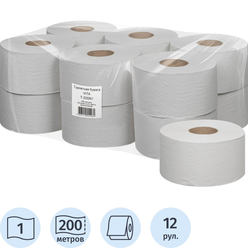 Бумага туалетная в рулонах 1-слойная 12 рулонов по 200 метров (артикул производителя T-200N1). Предназначена для санитарно-гигиенического обеспечения мест общественного пользования с большой и средней проходимостью. Цвет натурального бумажного волокна. Благодаря тиснению бумага мягкая и приятная на ощупь. Белизна бумаги 65-75%. Время растворения бумаги в воде не более 7 секунд.Изготовлена из смешанного сырья. Поставляется упаковками по 12 рулонов.