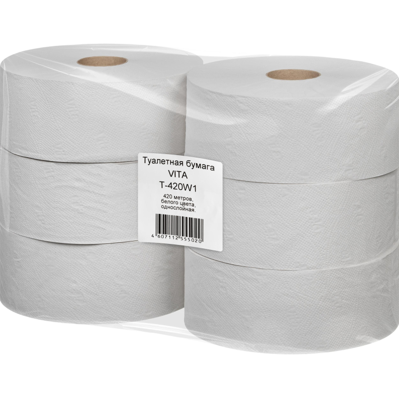 Бумага туалетная в рулонах 1-слойная 6 рулонов по 420 метров (артикул производителя T-420W1). Предназначена для санитарно-гигиенического обеспечения мест общественного пользования с большой и средней проходимостью. Бумага туалетная для диспенсера. Без перфорации. Благодаря тиснению - бумага мягкая и приятная на ощупь. Цвет белый. Белизна бумаги - 75%. Время растворения бумаги в воде не более 7 секунд.Изготовлена из смешанного сырья. Поставляется упаковками по 6 рулонов.