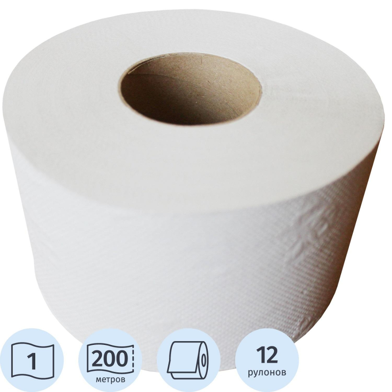 Бумага туалетная в рулонах 1-слойная 12 рулонов по 200 метров (артикул производителя T-200N1). Предназначена для санитарно-гигиенического обеспечения мест общественного пользования с большой и средней проходимостью. Цвет натурального бумажного волокна. Благодаря тиснению бумага мягкая и приятная на ощупь. Белизна бумаги 65-75%. Время растворения бумаги в воде не более 7 секунд.Изготовлена из смешанного сырья. Поставляется упаковками по 12 рулонов.