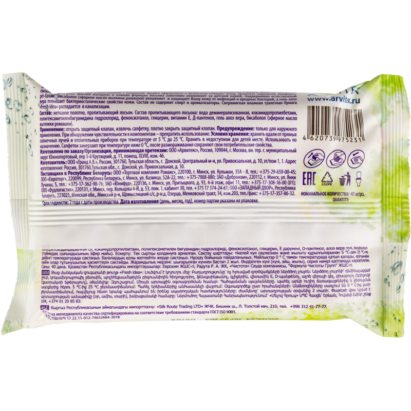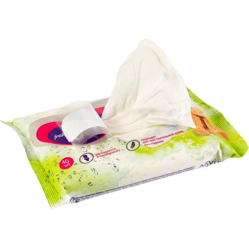 Бумага туалетная влажная детская Fresh idea 40 листов в пачке.Влажную туалетную бумагу Fresh idea можно использовать как самостоятельное средство гигиены, так и в дополнении к обычной туалетной бумаге. Она изготовлена из мягкого, нежного материала аэрлейд, не содержит спирта, поддерживает нейтральный ph. Полностью растворяется в канализации. Экстракт ромашки очищает и защищает кожу от инфекций и вредных бактерий. Экстракт алое повышает бактериостатические свойства кожи.Состав: глицерин, витамин е, пантенол, нетканое полотно, лосьонная основа.