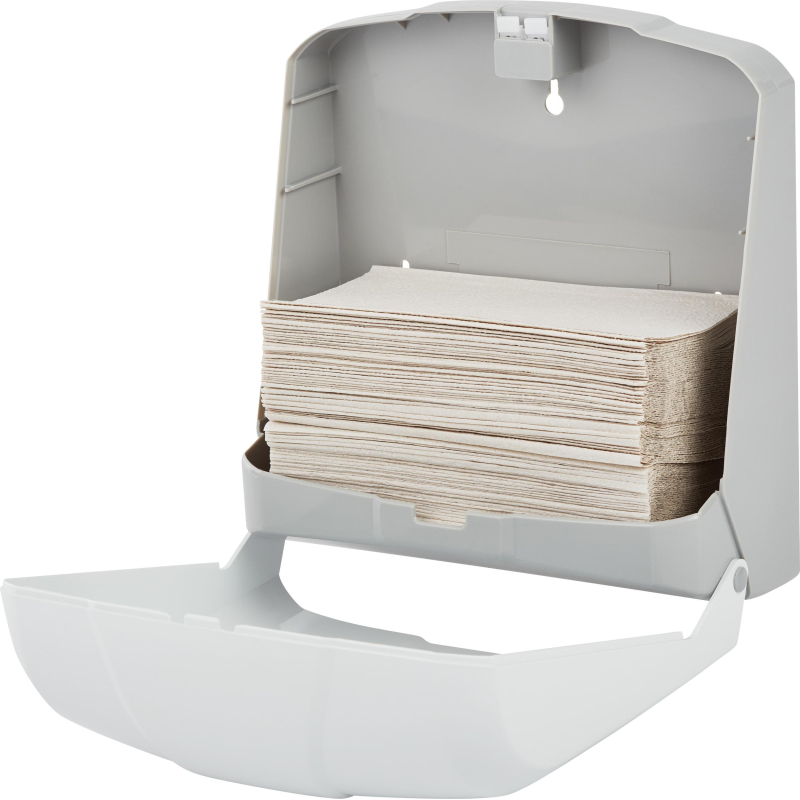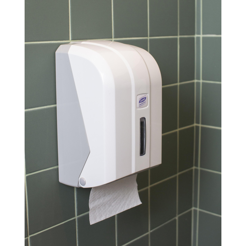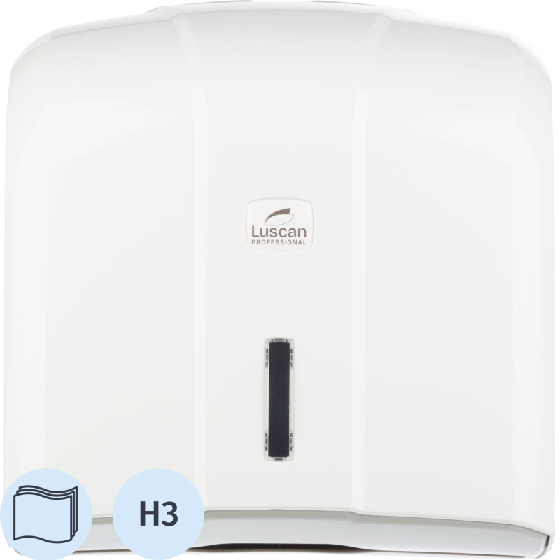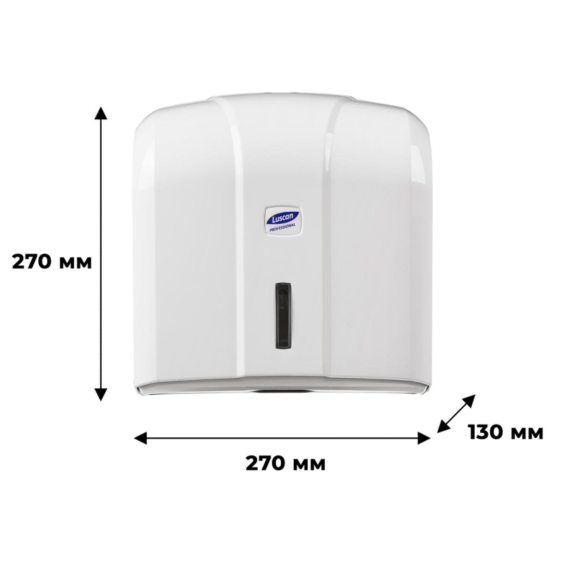 Диспенсер для листовых полотенец Luscan Professional V пластиковый белый (код производителя 479407). Диспенсер Luscan Professional для листовых бумажных полотенец сложения V (ZZ) идеально подходит для использования в местах со средней и высокой проходимостью, таких как туалетная комната в ресторане, офисе, торговом центре, аэропорту, железнодорожном вокзале. Диспенсер для полотенец имеет эргономичную форму и компактные размеры. Диспенсер отвечает всем требованиям гигиены, обеспечивает полистовой бесконтактный забор полотенец, имеет окно визуального контроля. Изготовлен из высококачественного белого ABS-пластика. Крышка закрывается на замок-защелку сверху. Внизу крышка фиксируется на 'клипсах' так, что ось вращения крышки находится параллельно полу и стене. Соответственно при открытии крышка (она же передняя панель диспенсера) открывается сверху вниз. Вместимость - 400 листов. Размер диспенсера (ВxШxГ): 27x27x13 см. Материал: пластик. Комплект поставки: диспенсер, ключ и саморезы для крепежа диспенсера. Гарантийный срок: 1 год.