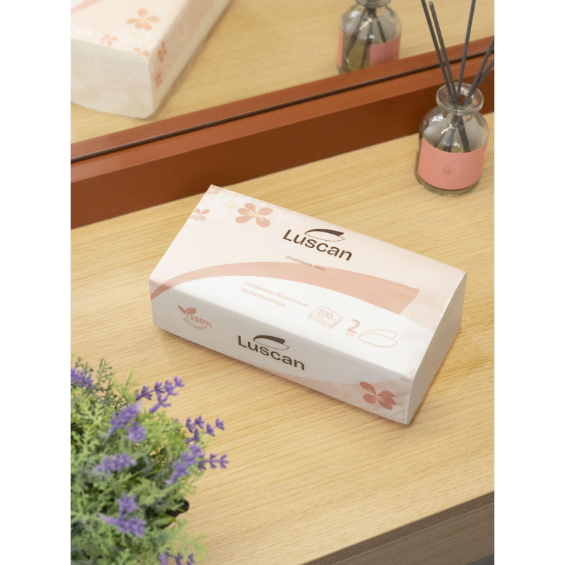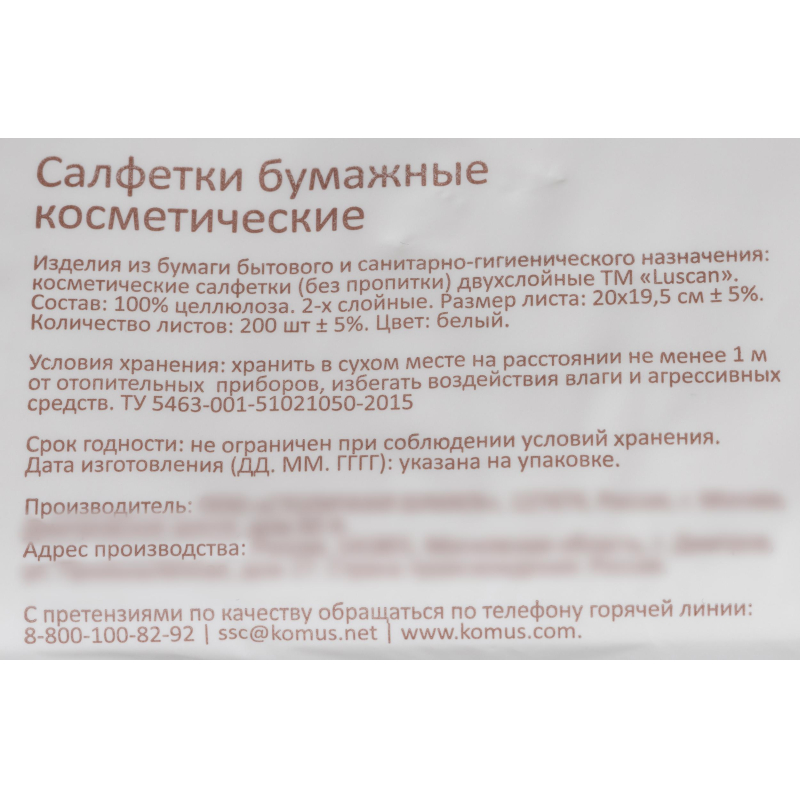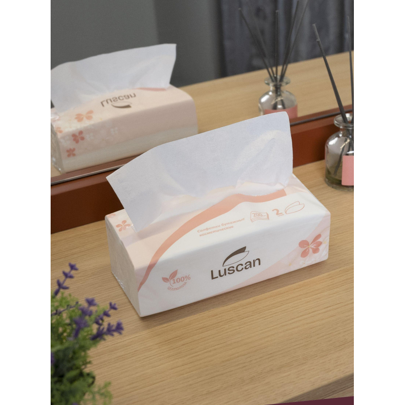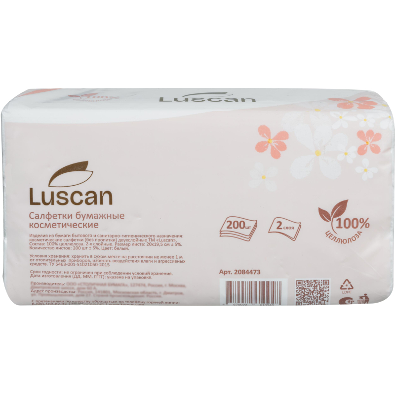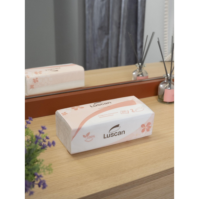 Салфетки двухслойные косметические Luscan в мягкой упаковке по 200 штук Салфетки бумажные Luscan идеальны для ежедневных косметических целей. Двухслойные салфетки отлично впитывают влагу и легко достаются из упаковки благодаря перфорации. Изготовлены из 100% целлюлозы без красителей и отдушек. Салфетки мягкие и прочные, приятные на ощупь. Размер салфетки: 20х19,5 см. Поставляются в мягкой упаковке по 200 штук.