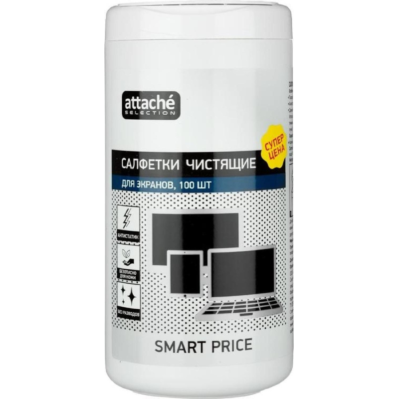 Салфетки влажные Luscan/Attache Selection Smart Price для экранов (100 штук в тубе). Влажные салфетки Luscan/Attache Selection изготовлены из нетканого материала повышенной плотности на основе полипропилена, предназначены для очистки LCD и TFT экранов мониторов, телевизоров, плазменных панелей, ноутбуков, стеклянных поверхностей сканеров, копиров и других устройств. Не оставляют разводов и ворса, обладают длительным антистатическим эффектом. Специальный состав с активными компонентами пролонгированного действия безупречно очищает поверхности от пыли и грязи, безопасен для кожи рук. Удобная туба-диспенсер с большой крышкой-дозатором препятствует высыханию салфеток. Материал повышенной плотности (18 г/кв.м) более эффективно очищает поверхность, исключает вероятность обрыва салфеток при вытаскивании. Состав: вода более 30%, нПАВ менее 5%, консервант менее 5%, антистатический компонент менее 5%, отдушка менее 5%. Размер одной салфетки: 112x110 мм. В тубе 100 штук. После распаковки следует вытягивать салфетки из центра для вставки в крышку. Рекомендуем протирать сухой салфеткой после, во избежание разводов. Возможны поставки с разным типом салфеток из крепированной бумаги или мельтбауна без возможности выбора. В рамках ребрендинга ТМ Attache Selection производится перевод данного артикула с ТМ Attache Selection на ТМ Luscan с сохранением всех потребительских характеристик товара. На переходный период допускается поставка данной продукции в двух вариантах дизайна упаковки.