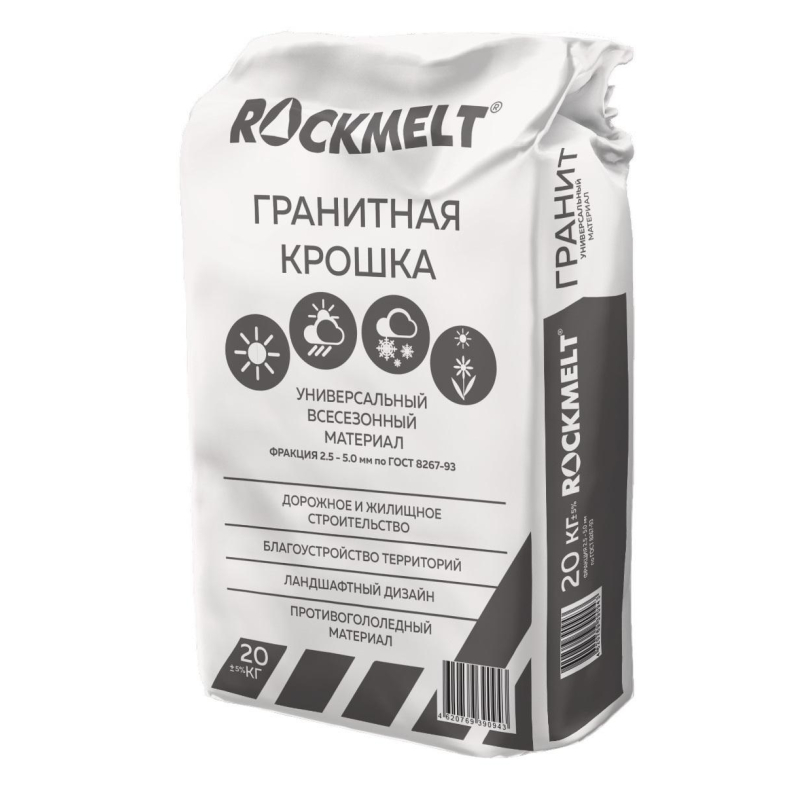 Реагент противогололедный RockMelt мешок 20 кг до -15°C. Реагент противогололедный Rockmelt гранитная крошка предназначен для обработки пешеходных зон и тротуаров с твердым покрытием, дорог и улиц, внутридворовых территорий, лестничных сходов, пандусов. Используется на поверхностях покрытых плотным снежным накатом и льдом, а также на чистых поверхностях для предупреждения скольжения на льду. Гранитная крошка предотвращает скольжение за счет механического взаимодействия с поверхностью, эффективна во всем диапазоне температур. Работает при температуре до -15°С. Мешок 20 кг рассчитан на 400 кв.м. Состав: гранитная крошка фракция 2.5-5.0 мм по ГОСТ 8267-93. Меры предосторожности: оказывает умеренно раздражающее действие на кожу и слизистые оболочки. Не употреблять в пищу. При попадании в глаза промыть водой. При работе с материалом рекомендуется использовать перчатки. Условия хранения: хранить в недостпуных для детей и домашних животных местах, в неповрежденной упаковке, в крытых помещениях, исключающих попадание влаги. Материал гигроскопичен, для сохранения потребительских свойств плотно закрывать упаковку после каждого применения. Упакован в полипропиленовые клапанные мешки по 20 кг. Срок хранения не ограничен при соблюдении условий хранения и целостности упаковки.