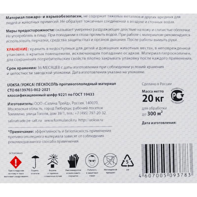 Реагент противогололедный UOKSA Пескосоль мешок 20 кг до -10°С. Этот комбинированный реагент представляет собой смесь технической соли и песка, эффективно использующуюся при температурах до -10°C для устранения льда и снега. Он проникает в толщу льда, разрушая его структуру и облегчая последующую очистку. Подходит для обработки дворов, пандусов, лестниц, автомобильных и пешеходных дорог, тротуаров. Норма расхода составляет 100 г/кв.м. Упакован в полипропиленовый мешок по 20 кг. Важно избегать контакта с железом и другими металлами, подверженными коррозии. Хранить в помещении при относительной влажности воздуха не более 75%. Срок хранения: 5 лет при соблюдении условий хранения. Рабочая температура: до -10°C. Срок годности: 36 месяцев. Тип: комбинированный реагент. Вес: 20 кг. Применение: внутридомовая территория, любые типы дорог, пешеходные дорожки. Безопасность: не токсичен, безопасен для животных, не повреждает лакокрасочные покрытия. Состав: хлорид натрия. Страна происхождения: Россия. Площадь обработки: до 300 кв. м. Вид реагента: пескосоль. Фракция: 2-5 мм. Внешний вид и/или характеристики товара могут быть изменены производителем в соответствии с производственным процессом.