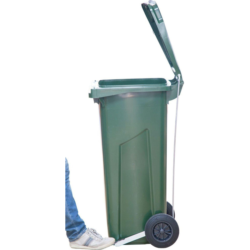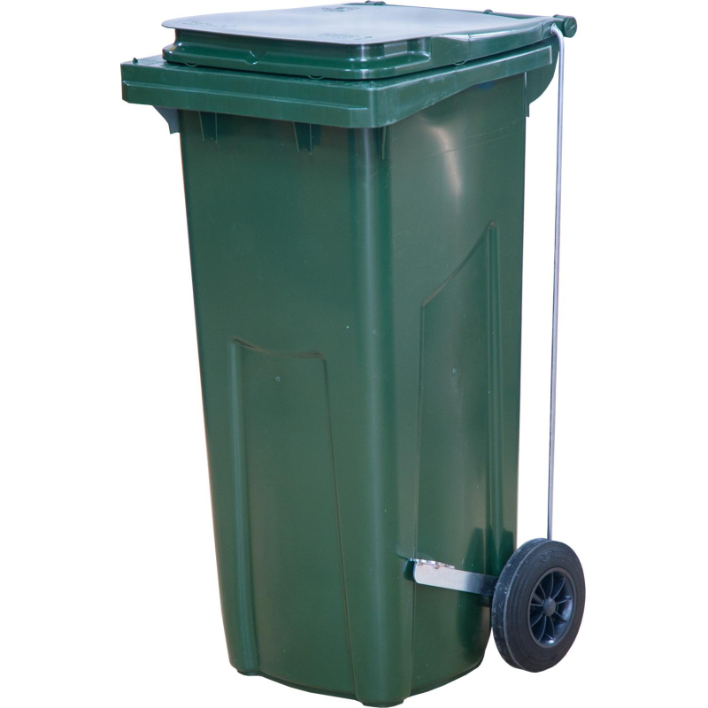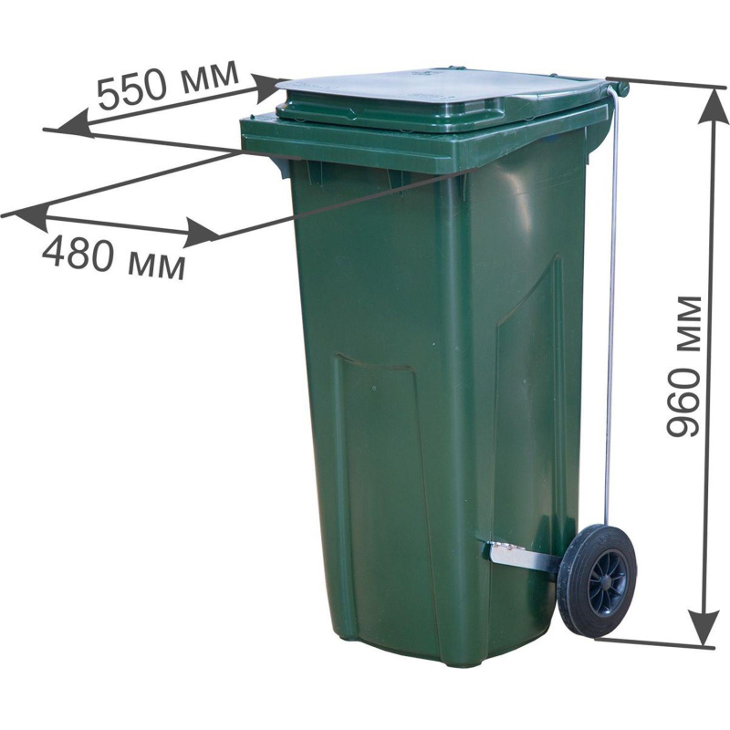 Контейнер-бак мусорный 120 л пластиковый на 2-х колесах с крышкой зеленый Передвижной мусорный контейнер (120 литров с крышкой) обладает значительным объемом для хранения бытовых и промышленных отходов на придомовых территориях, в производственных цехах, минимаркетах, кухнях кафе и ресторанов и т. д. Два больших прорезиненных колеса диаметром 200 мм обеспечивают мобильность изделия, а прочный пластик гарантирует длительный период использования и значительную нагрузку. Контейнер оснащен герметичной крышкой, что исключает распространение запахов. Подходит для раздельного сбора мусора. Контейнер оснащен усиленной передней гребенкой для работы с мусоровывозящей техникой. Грузоподъемность контейнера на 120 литров - 60 килограмм. Есть ручки. Оснащен педальным механизмом. Используемый материал характеризуется: легкостью, высокой прочностью, устойчивостью к выцветанию, к воздействию агрессивных химических веществ, к перепадам температур; возможно использование при низких и высоких температурах (от - 40°С до 60°С). Высота контейнера-бака: 96 см (с крышкой), 95 см (без крышки) Размер по верхней кромке: 55x48 см. Размер дна: 25x34 см. Размер крышки: 44x44 см. Диаметр колес: 200 мм. Цвет: зеленый. Вес: 7,5 кг. Оттенок цвета может отличаться в зависимости от партии товара. Внимание! Поставляется в разобранном виде!Внимание: в характеристике "Объем рекомендуемого мешка" указан минимальный объем мешка, который подойдет для изделия. Рекомендуется приобретать мешки указанного, либо большего объема.