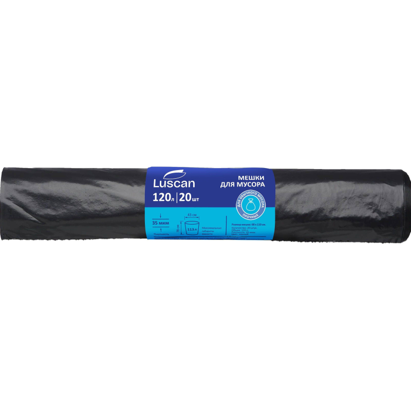 Мешки для мусора Комус 120 л черные (ПВД, 35 мкм). Полимерные мешки для мусора подходят для складирования легких отходов (бумаги, пластика, товарной упаковки). Изделия легко отделять от скрутки, не повреждая материал, благодаря перфорации по линиям отрыва. Черные мусорные пакеты вместимостью 120 литров удобны в домашнем обиходе, офисах, производственных помещениях, социальных учреждениях (медицинских, образовательных), салонах красоты, гостиницах, досуговых заведениях, фитнес-клубах и на других объектах. Изготовлены из полиэтилена высокого давления (ПВД) плотностью 35 микрометров, объем 120 литров. Упакованы по 20 пакетов в рулоне. Цвет: черный. Размер (ШхД): 68х110 сантиметров.