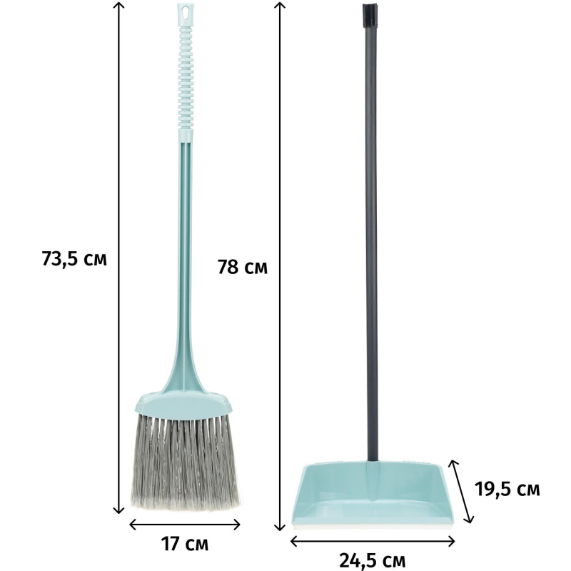 Набор для уборки Idea Ленивка (веник, совок с длинной ручкой)Набор для уборки помещений Ленивка (с веником) из качественных износостойких материалов удобен для сухой уборки в небольших помещениях. Подходит для всех покрытий, включая деликатный паркет и ламинат, облегчает уборку в труднодоступных местах.В состав набора входит: веник и совок с длинной ручкой. Высота набора в собранном виде 81,5 см, ширина 24,5 см, глубина 19,5 см.ВеникВыполнен из практичного материала, имеет ширину в 17 см. Густая, распушенная щетина, достаточно компактна, чтобы подмести в самых узких местах. Ручка обладает отверстием для подвеса и ребристой поверхностью.Размер основания веника (толщина = глубина) 3,3 см, длина щетины 13,5 см, высота веника с ручкой 73,5 см.Материал ручки: пластик.СовокС длинной ручкой. Прорезиненное основание обеспечивает более качественный сбор мусора. Поверхность совка сделана под уклоном - это препятствует вываливанию мусора при заметании. В ручке совка предусмотрен держатель для удобного и компактного хранения веника. Размер совка: длина (глубина) 19,5 см, ширина 24,5 см, высота с черенком 78 см.Материал совка: пластик.Цвет совка/веника: морская волна.Вес комплекта: 380 г.