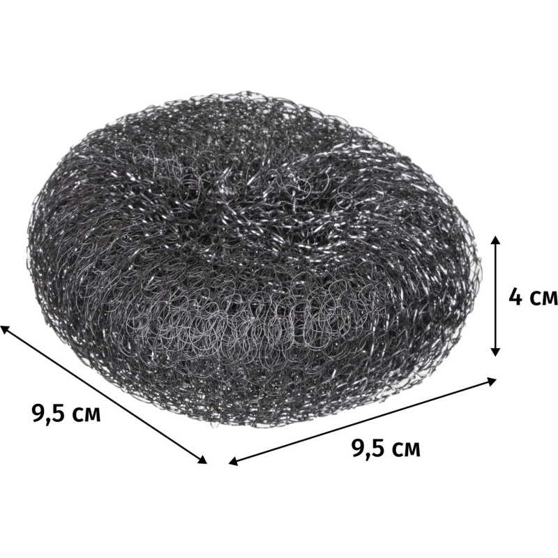 Предназначены для удаления сильных загрязнений с посуды, плит, раковин. Не рекомендуется использовать для чистки тефлоновых поверхностей. Упакована в полиэтиленовый пакетик. Состав: нержавеющая сталь. Размер: 40x95x95 мм. Диаметр - 9,5 см., вес - 34,8 г.