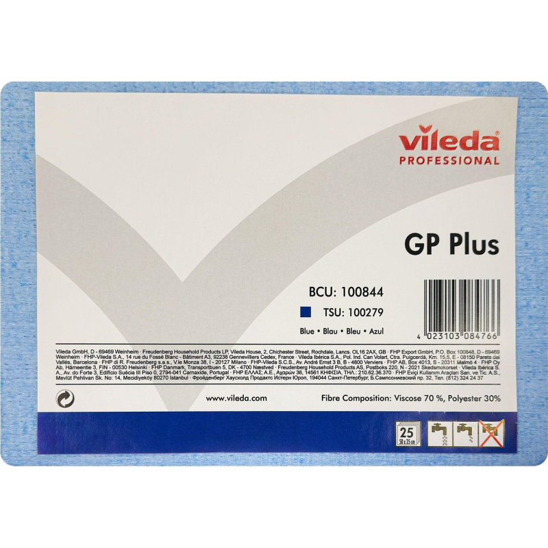Салфетки хозяйственные Vileda Professional ДжиПи Плюс вискоза/ПЭС 50x35 см 62 г/кв.м синие (25 штук в упаковке). Назначение: базовая нетканая салфетка с коротким сроком использования. Салфетка используется для ежедневной уборки поверхностей с использованием моющих средств, в том числе для протирки столов на предприятиях общественного питания. Особенности и преимущества: - благодаря пористой структуре салфетка хорошо собирает грязь и быстро сохнет, - хорошо собирает влагу и отжимается, - увеличенный размер салфетки помогает убирать большую площадь за один раз, - салфетка доступна в 4-х цветах для исключения перекрестных загрязнений: синий, красный, зеленый, желтый, - салфетка рекомендована к применению как однодневная. Характеристики: - размер: 50x35 сантиметров,- толщина: 0.95 миллиметров, - вес одной салфетки: 14 грамм (80 грамм на квадратный метр). - максимальная впитываемость в сухом состоянии: 780 % от собственного веса,- состав: 70 % вискоза, 30 % полиэстер, акриловое связующее, - цвет: синий,- количество в упаковке: 25 штук.