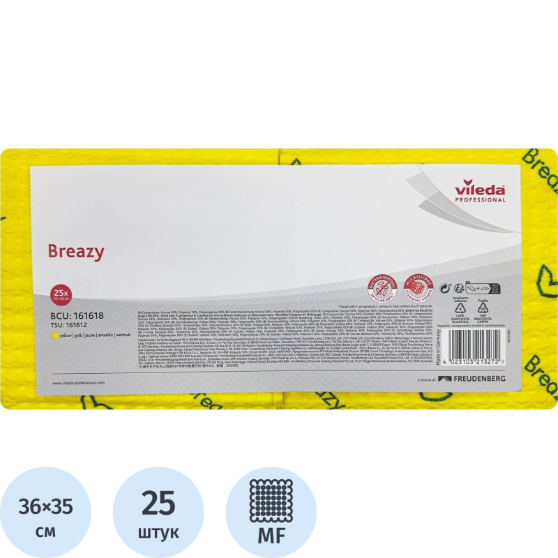 Салфетки хозяйственные Vileda Professional Бризи микрофибра 36х35см 105 г/кв.м синие (25 штук в упаковке).Уникальная запатентованная салфетка, созданная для ресторанов, баров и кафе. Профессионально протирает поверхности, собирая мусор разного размера и влагу одновременно. Микроволокно в составе Бризи придает салфетке высокие чистящие свойства, а объемная структура обеспечивает эффективный подбор мусора с поверхности. Уникальная волнообразная структура салфетки запатентована компанией Freudenberg. Волны образуют карманы, которые захватывают на 40% больше частиц грязи по сравнению с традиционными салфетками. Особенности и преимущества: - запатентованная поверхность с волнообразной структурой позволяет подбирать на 40% больше мусора по сравнению с обычной гладкой салфеткой, - за счет увеличенного содержания микроволокна в структуре материала, позволяет удалять бактерии с убираемых поверхностей, - салфетки Бризи убирают до 99.73% бактерий с поверхности без использования дезинфектанта, - мультифункциональная: хорошо собирает влагу и загрязнения. В сухом виде отлично собирает сыпучий мусор, например, крошки, - мягкая на ощупь и объемная в руке, - доступна в 4 ярких цветах для цветовой кодировки и исключения перекрестных загрязнений: синий, красный, желтый, зеленый, - салфетка рекомендована к использованию как однодневная, но также способна выдерживать машинные стирки, - высокое качество от европейского бренда. По результатам лабораторных испытаний салфетки, смоченной нейтральным чистящим средством в лаборатории BMA-Labor GBR, Германия от 08.03.2019 г. Размер: 36x35 сантиметров. Толщина: 3.6 миллиметра. Вес одной салфетки: 13 грамм (105 грамм на квадратный метр). Максимальная впитываемость в сухом состоянии: 600% от собственного веса. Количество машинных стирок: до 30 при температуре 60 °C и соблюдении рекомендаций Vileda Professional. Состав: 50% вискоза, 30% микроволокно полиэстеровое, 20% полипропилен. Цвет: желтый. Количество в упаковке: 25 штук.
