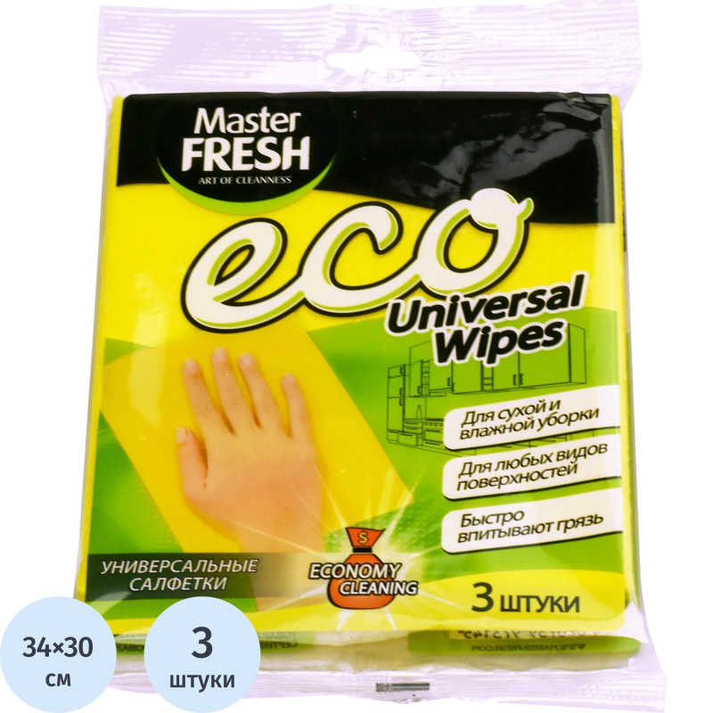 Салфетки хозяйственные Master Fresh Эконом вискоза 30x34 см 80 г/кв.м желтые (3 штуки в упаковке). Назначение: универсальные салфетки для уборки из вискозы позволяют быстро и качественно очистить от грязи и пыли все виды поверхностей. Для сухой и влажной уборки. Особенности и преимущества: - Не оставляют разводов и ворсинок. - Отлично впитывают влагу, легко выжимаются и быстро сохнут. Характеристики: - размер: 30x34 сантиметров, - цвет: желтый,- плотность: 80 грамм на квадратный метр, - состав: вискоза, полиэстер - 3 штуки в упаковке. Рекомендации по уходу: хранить в сухих закрытых вентилируемых помещениях при температуре окружающей среды от + 5 до + 25 °С и относительной влажности до 80%. Изделие должно быть защищено от прямого воздействия влаги, агрессивных сред, солнечного света и теплового воздействия нагревательных приборов и других источников тепла. Хранить в недоступном для детей месте. Совет: после использования тряпку тщательно промыть и высушить. В целях предотвращения распространения бактерий и неприятного запаха, тряпку рекомендуется менять каждые 10 дней.