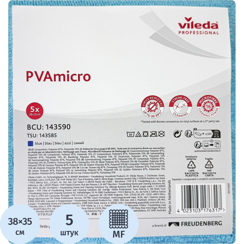 Салфетки хозяйственные Vileda Professional ПВА Микро микрофибра 38х35 см 250 г/кв.м синие (5 штук в упаковке).Салфетка ПВАмикро от Vileda Professional из микроволокна с уникальным ПВА покрытием предназначена для профессиональной уборки любых поверхностей. Запатентованное ПВА покрытие обеспечивает быстрое впитывание влаги, а микроволокно глубоко проникает в структуру поверхности, очищая её за одно движение.Для удобства уборки салфетки представлены в четырёх цветах: синий (арт. 911810), красный (арт. 911812), жёлтый (арт. 911811), зелёный (арт. 515200).Салфетка ПВАмикро эффективно собирает влагу и очищает поверхности от пыли, сора, жировых загрязнений, отпечатков пальцев, а также бактерий и вирусов. Подходит для ежедневной универсальной уборки и финишной протирки любых поверхностей и материалов, включая мебель, смесители и сантехнику, столешницы, пластик, зеркала, стекло, мониторы.Используется с методами уборки Свеп Про и 'ведро-вода'.Особенности и преимущества:- уникальная, инновационная и запатентованная салфетка из микроволокна со специальным ПВА покрытием;- за счёт ПВА покрытия и микроволокна салфетка эффективно и быстро удаляет загрязнения за одно движение, что сокращает время уборки и повышает производительность труда;- ультратонкое микроволокно разделено на 16 сегментов для глубокого проникновения в поры поверхности и эффективной очистки;- обладает супервпитываемостью, благодаря которой поверхность моментально сохнет и не требует дополнительной протирки;- не оставляет мелких капель, разводов и ворса;- салфетки ПВАмикро убирают до 99,99 % коронавируса типа BCoV с поверхностей без использования дезинфектанта;- отлично выполаскивается от таких мелких частиц, как песок, крошки, земля, пыль, что позволяет исключить царапины на деликатных поверхностях;- благодаря объёмной структуре салфетку удобно держать в руке, споласкивать и отжимать;- 4 цвета для цветовой кодировки и исключения перекрёстных загрязнений;- возможность использования с кислотными моющими средствами для уборки санитарных зон в рабочей концентрации;- долгий срок службы.Продукт произведён в Нидерландах.Область применения:Идеальна для уборки коммерческой недвижимости, HoReCa (санатории, отели, рестораны, кафе, бары, столовые, кейтеринг), производств, объектов здравоохранения и клининга.Салфетка ПВАмикро - это высококачественный инструмент для эффективной, экологичной и профессиональной уборки.Характеристики:- размер: 38x35 см;- толщина: 1,4 мм;- вес: 33 г;- плотность: 250 г/кв. м;- максимальная впитываемость в сухом состоянии: 550 % от собственного веса;- состав: микроволокно - 87 % полиэстер, 13 % полиамид, покрытие PVA (полимер винилацетата / polyvinyl acetate);- количество машинных стирок: до 300 при температуре 60 C и соблюдении рекомендаций Vileda Professional;- количество штук в упаковке: 5 шт.