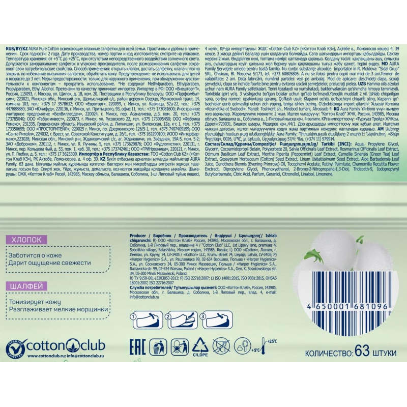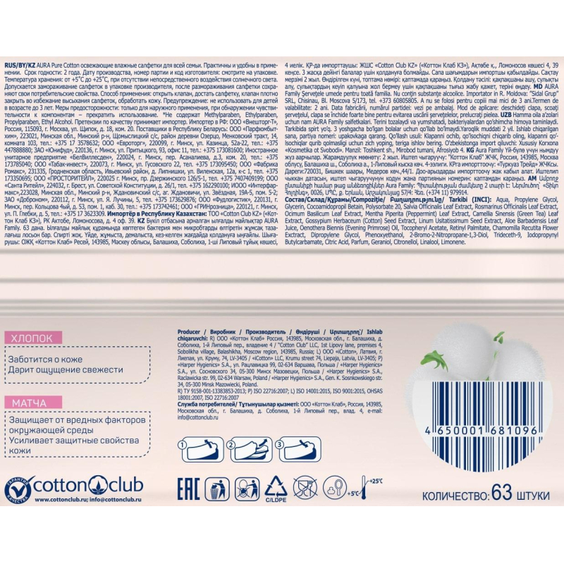 Влажные салфетки Aura освежающие для всей семьи. В экономичной упаковке содержатся 63 салфетки. Освежающие влажные салфетки Aura эффективно очищают, надолго освежают и тонизируют. В составе пропитывающего салфетки лосьона - экстракт ромашки, обладающий противовоспалительными свойствами. Салфетки обладают приятным ароматом. Удобны в применении, незаменимы в дороге и на отдыхе, подходят для детей. Меры предосторожности: только для наружного применения. При обнаружении чувствительности к компонентам - прекратить использование. Не обрабатывать раны и слизистые оболочки. Материал: нетканое полотно спанлейс (20% вискоза, 80% ПЭ). Состав: Aqua, Propylene Glycol, Glycerin, Cocoamidopropil Betain, Polysorbate 20, C hamomilla Recutita Flower Extract, Dipropylene Glycol, Phenoxyethanol, 2-Bromo-2-Nitropropane-1,3-Diol, Trideceth-9, Iodopropynyl Butylcarbamate, Citric Acid, Parfum, Hexyl Cinnamal, Butylphenyl Methylpropional. Из-за высокого содержания воды в составе, товар подвержен замерзанию при температуре ниже -5С. При оттаивании, товар не теряет качество и сохраняет все ключевые характеристики.