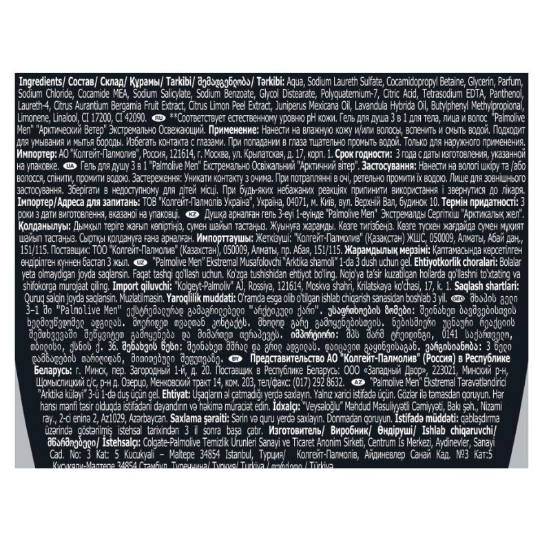Гель для душа Palmolive Men Арктический ветер 250 мл 250 мл Создан в комплексном уходе 3 в 1: для тела, лица и волос. Попробуй гель для душа Palmolive Арктический Ветер с ароматом бергамота и сочного лимона, которые дарят ощущение свежести и бодрости. Экстремально освежающая формула, разработанная специально для мужчин, способствует увлажнению кожи и укреплению структуры волос, делая их мягкими и сияющими, борется с неприятными запахами и сохраняет ощущение чистоты. Гель для душа Palmolive можно также использовать для бороды. - Перерабатываемая упаковкаx объемом 250 мл; - Обогащен 100% натуральными ингредиентами; - Без парабенов и силиконов, а нейтральная PHxx очищающая формула геля для душа бережно заботится о Вашей коже; - Произведен в Турции, соответствует международным стандартам качества и протестирован дерматологами. Состав: Aqua, Sodium Laureth Sulfate, Sodium Chloride, Cocamidopropyl Betaine, Parfum, Lauryl Hydroxysultaine, Sodium Salicylate, Sodium Benzoate, Glycol Distearate, Glycerin, Polyquaternium-7, Citric Acid, Tetrasodium EDTA, PEG-150 Pentaerythrityl Tetrastearate, Laureth-4, PPG-2 Hydroxyethyl Cocamide, Citrus Aurantium Bergamia Peel Oil, Citrus Limon Peel Extract, Juniperus Mexicana Oil, Lavandula Hybrida Oil, Limonene, Linalool, CI 17200, CI 42090. Способ применения: нанести на влажную кожу, вспенить и смыть водой. Избегайте контакта с глазами. При попадании в глаза тщательно промыть водой. Гель для душа является отличным подарком на новый год, день рождения, 23 февраля или просто без повода. Palmolive Men - Будь собой. Будь настоящим. Крышка и этикетка не перерабатываются. Соответствует естественному уровню рН кожи.